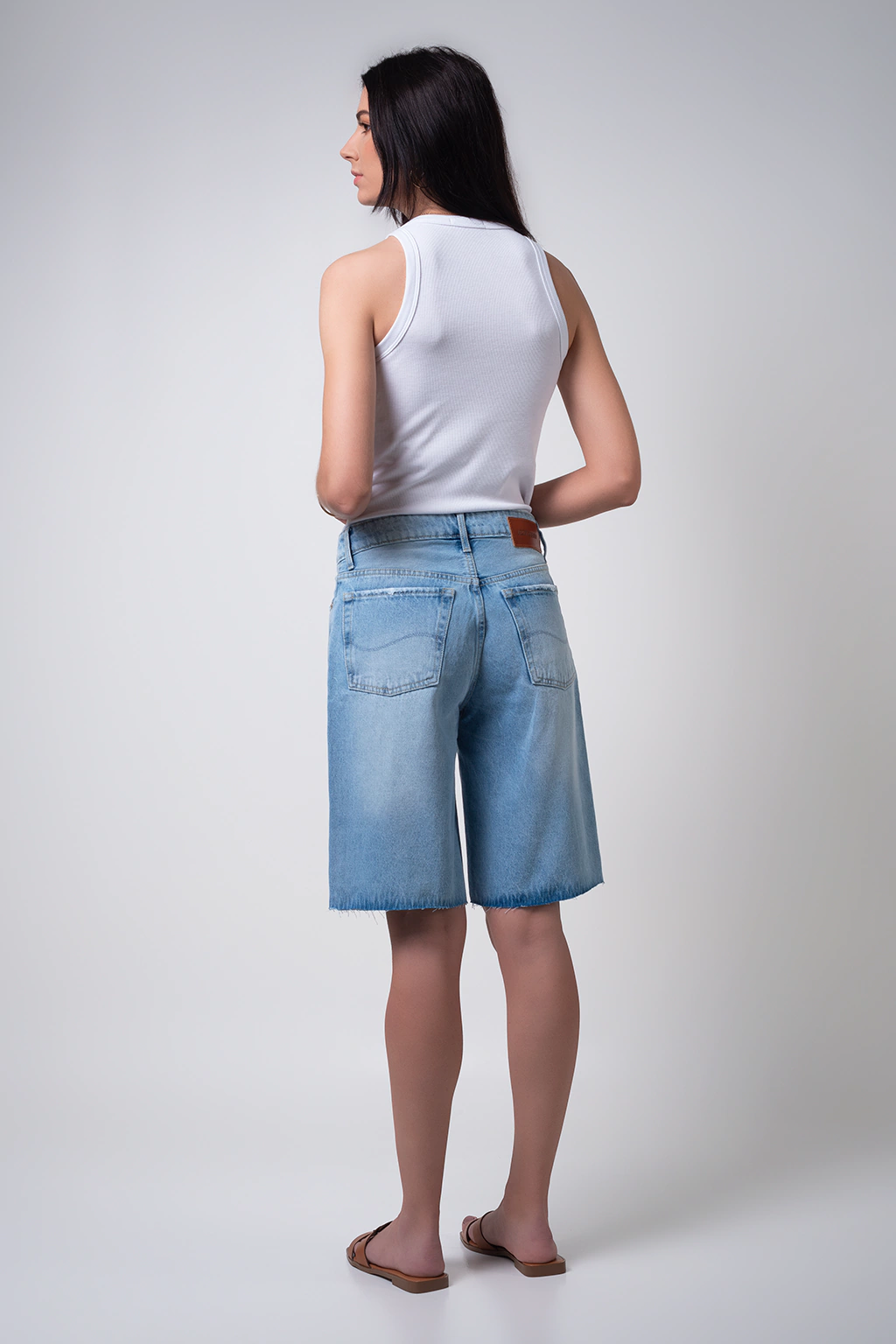 A bermuda é confeccionada em jeans puro algodão com lavagem clara, modelagem jorts, cintura alta, cós com passantes, fechamento frontal com botões, quatro bolsos funcionais e barra desfiada. Composição do Tecido: 100% Algodão