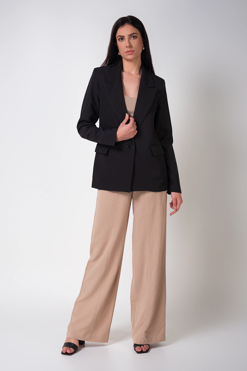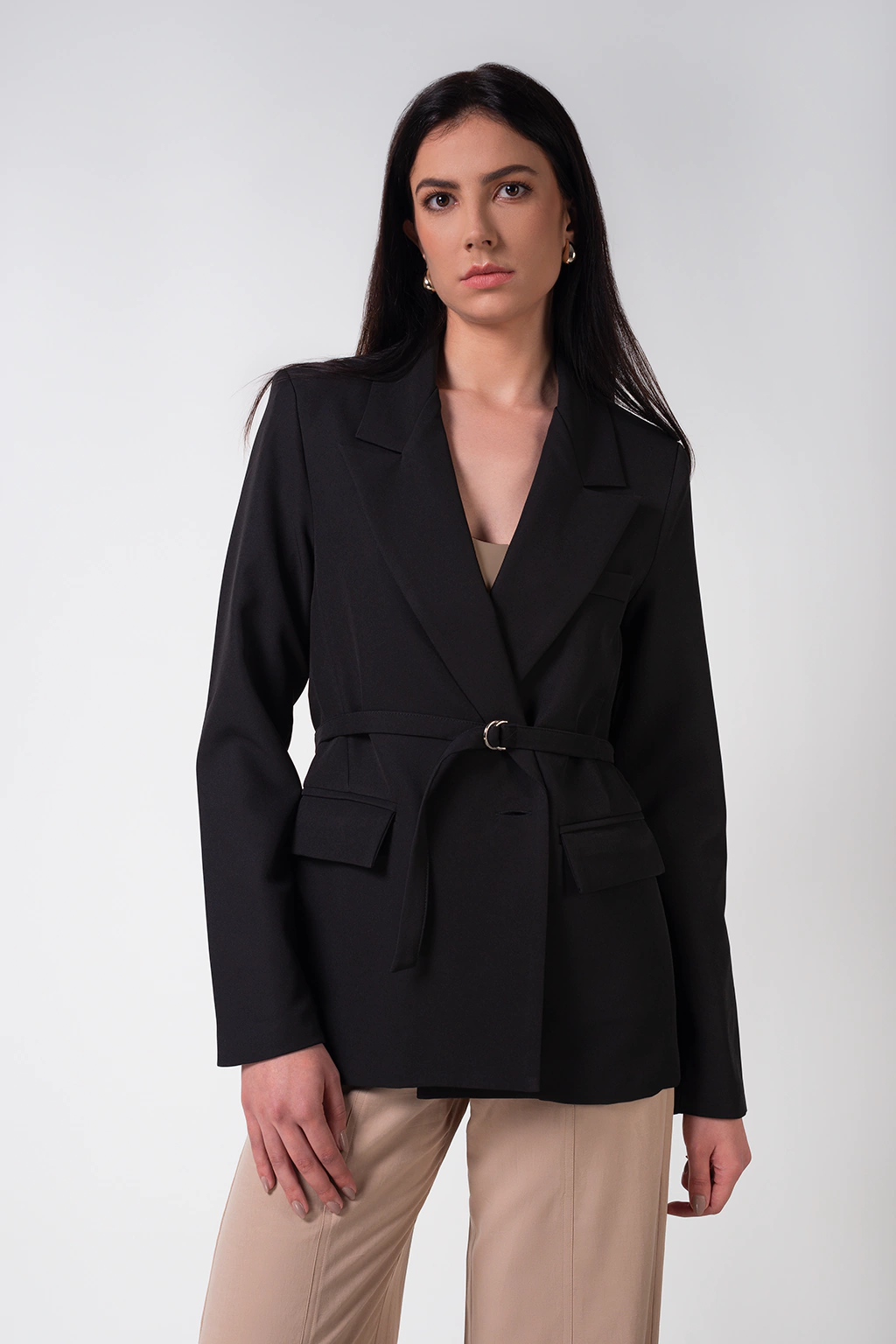 O blazer é confeccionado em tecido plano com toque macio, na cor preta, modelagem alfaiataria, possui caimento reto, dois bolsos funcionais com lapela, acompanha cinto faixa, fechamento frontal por botão e forro embutido. Composição do Tecido: 95% poliéster 5% elastano