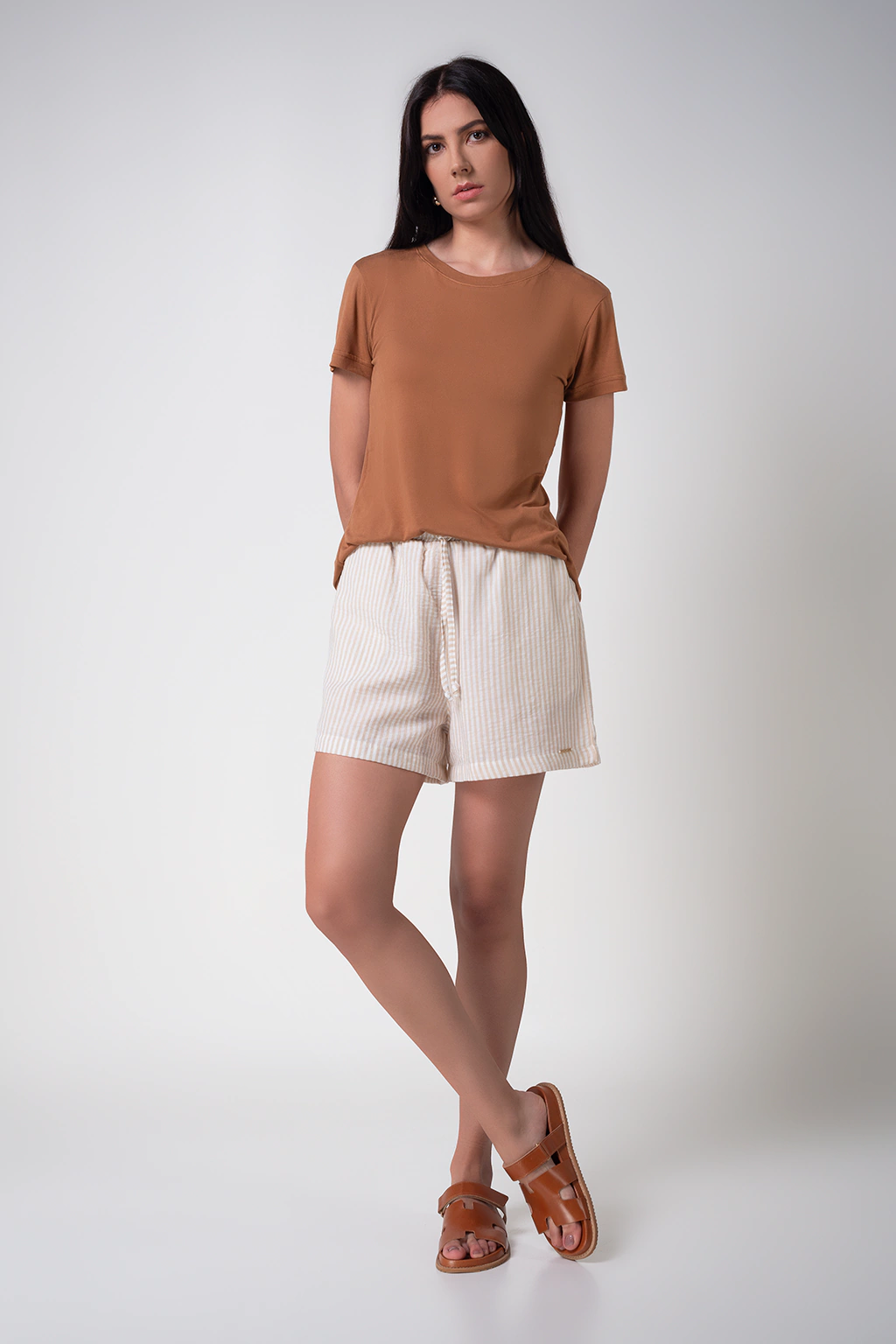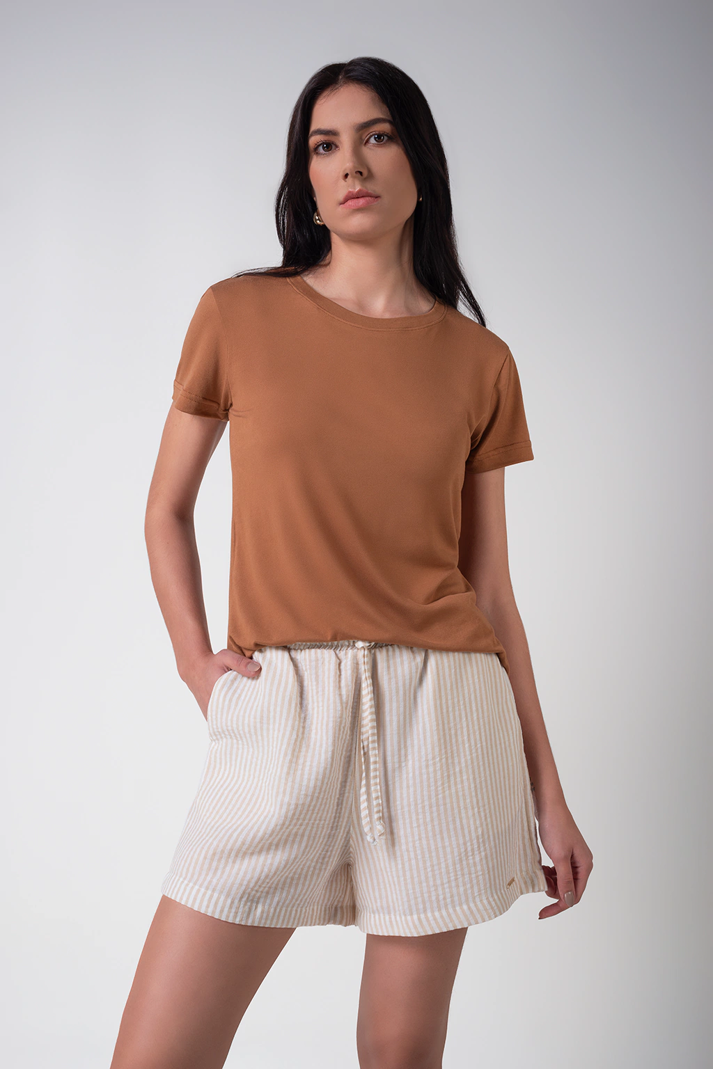 A blusa é confeccionada em tecido macio, suede com elasticidade, na cor marrom, comprimento médio, manga curta e gola redonda. Composição do Tecido: 95,5% poliester 4,5% elastano
