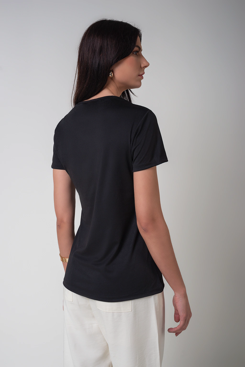 A blusa é confeccionada em tecido macio, suede com elasticidade, na cor preta, comprimento médio, manga curta e gola redonda. Composição do Tecido: 95,5% poliester 4,5% elastano