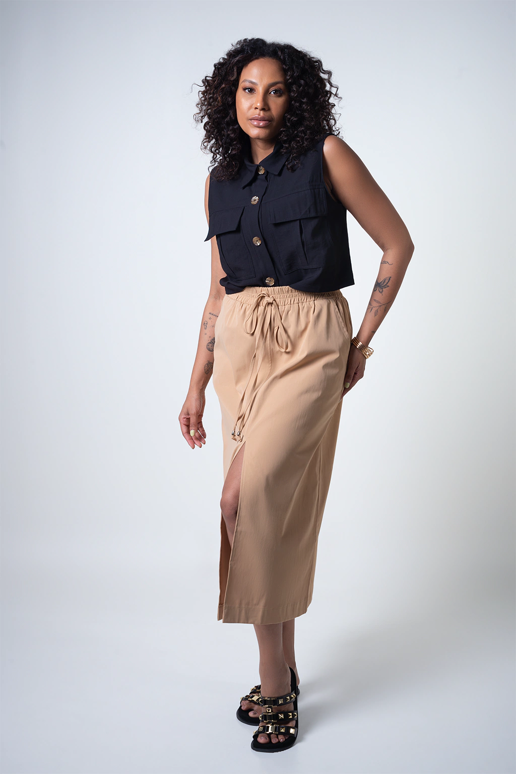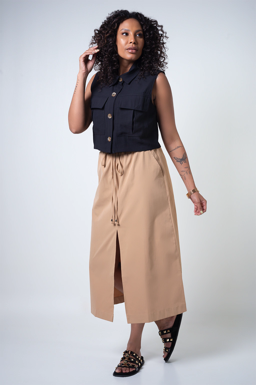 O colete é confeccionado em tecido estruturado e toque macio, com modelagem cropped soltinho, na cor preta, gola estilo camisa, fechamento com botões tartaruga e dois bolsos frontais funcionais. Composição do Tecido: 92% viscose 8% poliéster