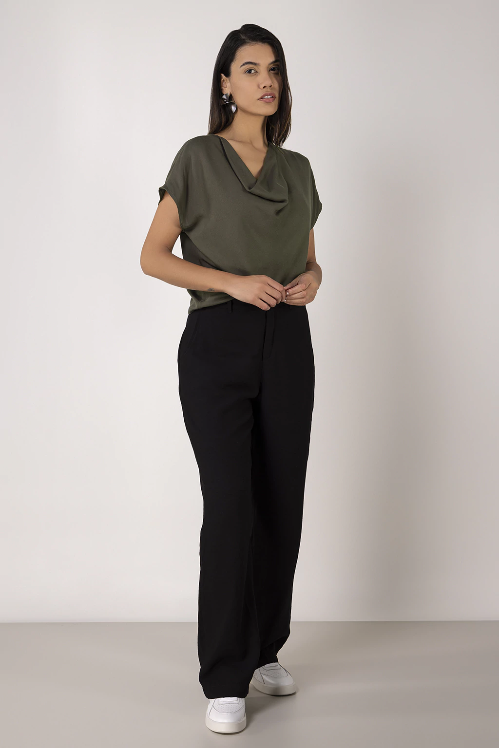 Uma blusa básica, porém, com aqueles detalhes que valorizam o shape. A blusa é confeccionada em viscose, um tecido leve, macio e fresco, na cor militar, a peça não possui elasticidade, comprimento médio, decote degade e mangas curtas.