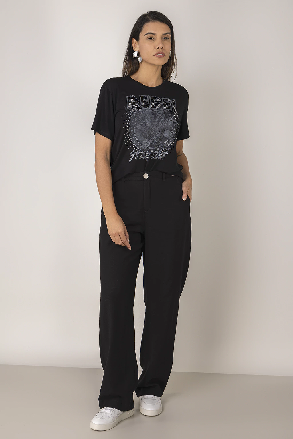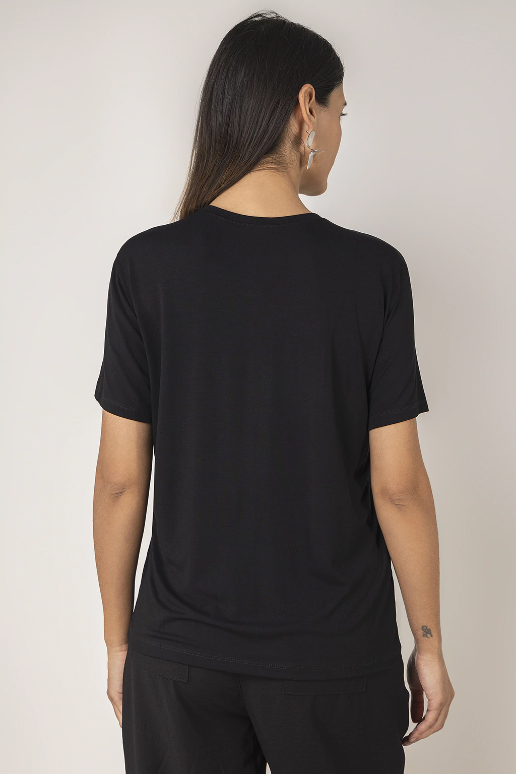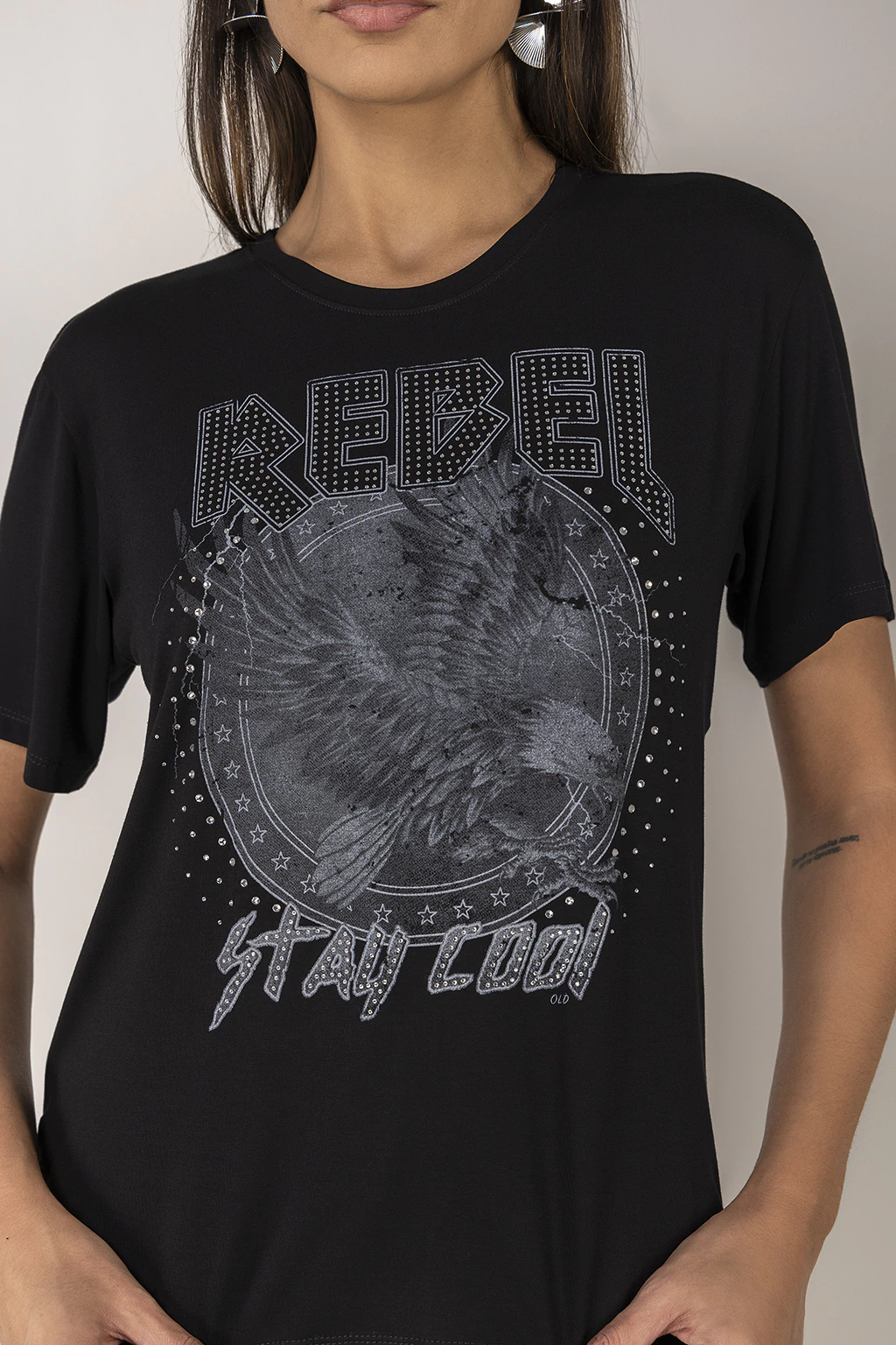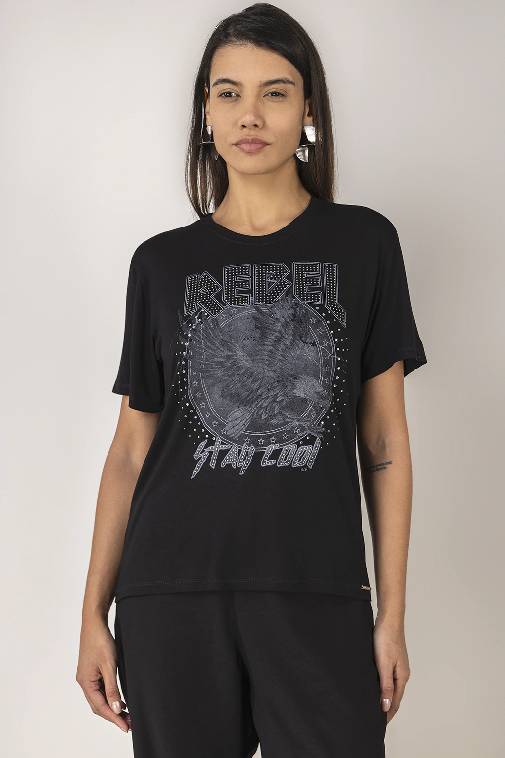 Uma blusa básica, porém, com aqueles detalhes que valorizam o shape. A blusa é confeccionada em viscose com elastano, um tecido leve, macio e fresco, na cor preta, a peça possui elasticidade e caimento soltinho no corpo, comprimento médio, gola redonda, manga curta e estampa cinza com detalhes em strass.