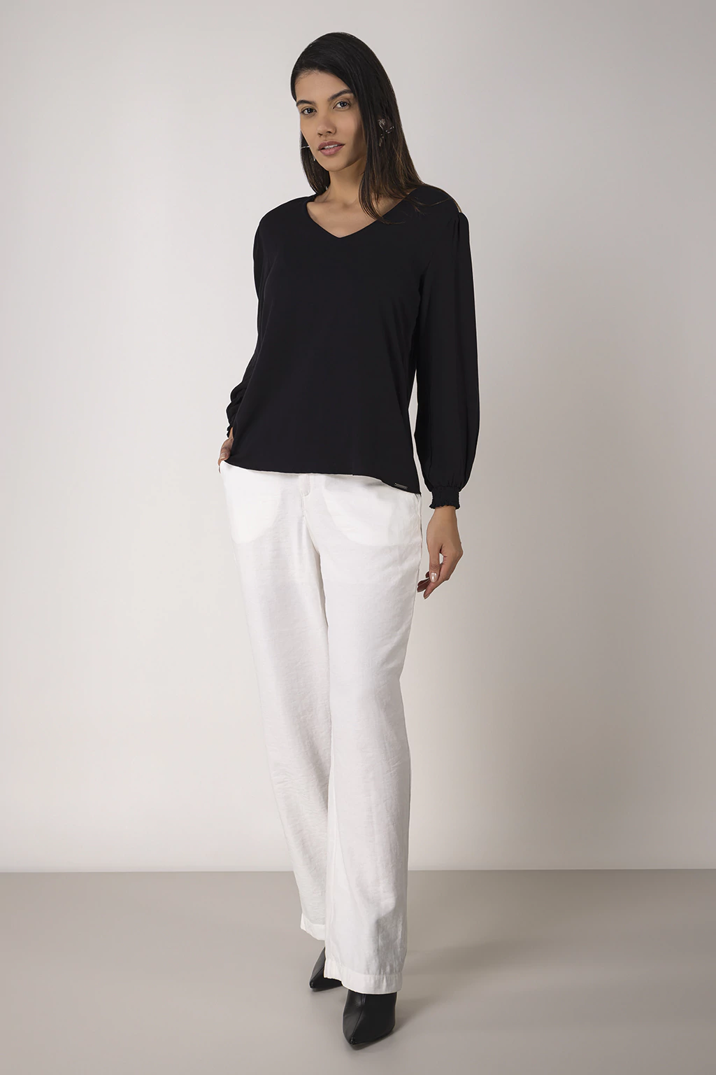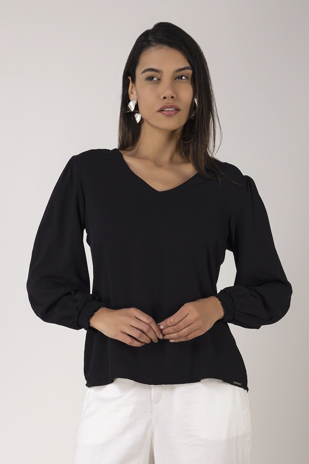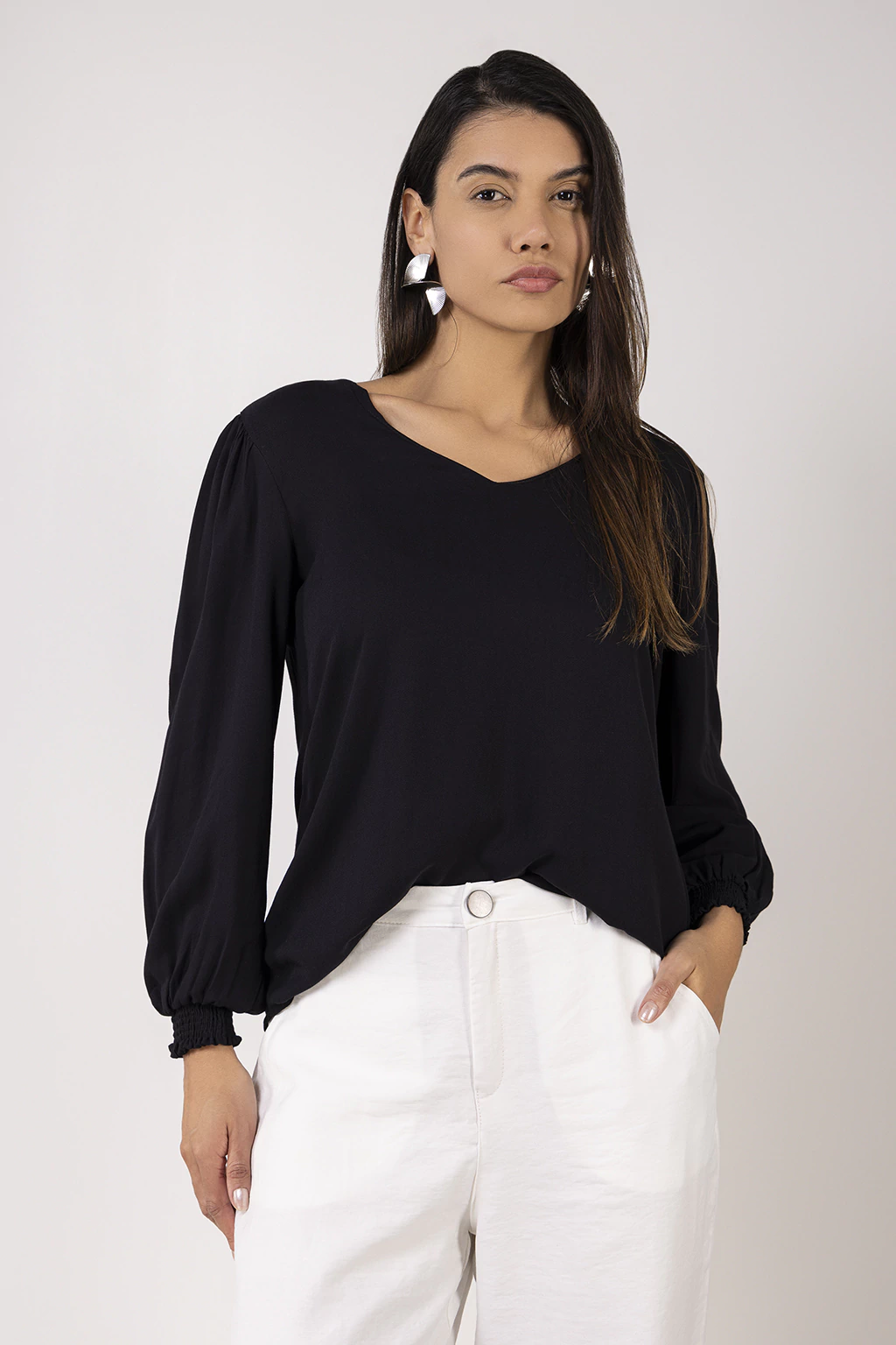 Uma blusa básica, porém, com detalhes que valorizam o shape. A blusa é confeccionada em viscose, um tecido leve e fresco, na cor preta, a peça não possui elasticidade, comprimento médio, gola em V com botão na parte de trás que ajuda na vestimenta, mangas longas com elástico no punho e detalhe franzido nos ombros.