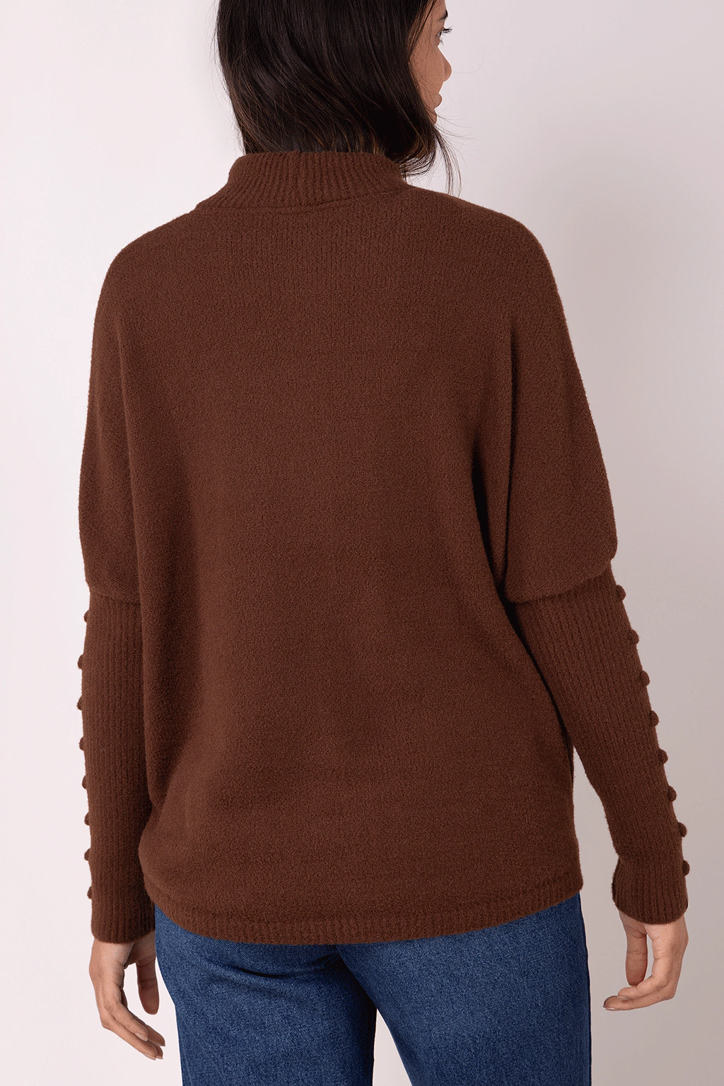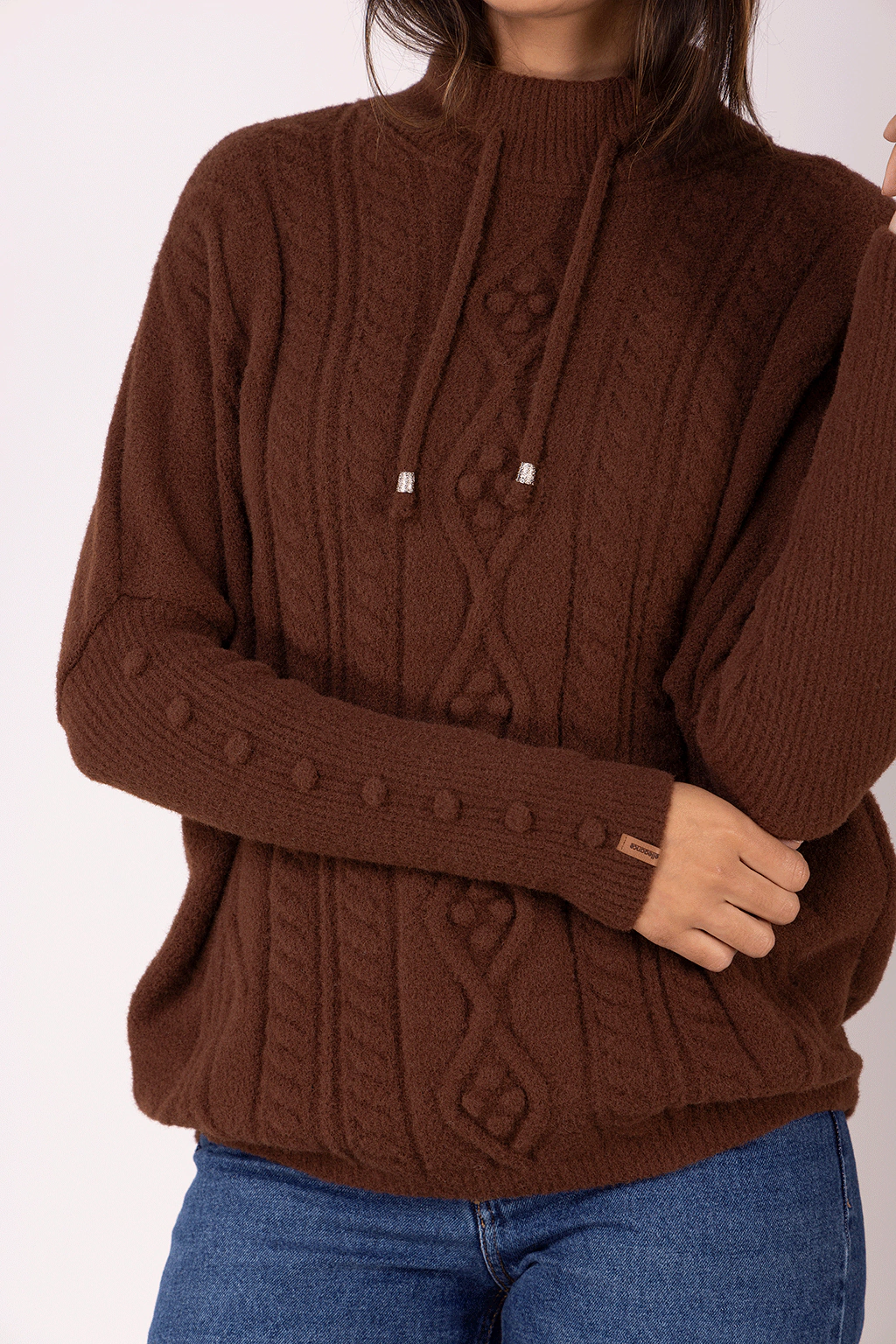 Na cor marrom, hit da temporada, perfeito para looks invernais cheios de personalidade. A modelagem mais ampla, alongada, além do tecimento trançado e detalhe do cordão com acabamento metálico permitem um visual descolado. Quentinha e aconchegante, graças ao fio pluma que é extremamente macio. Para completar o look combine com nossa calça jeans wide leg e nossa bota em camurça marrom com sola tratorada.