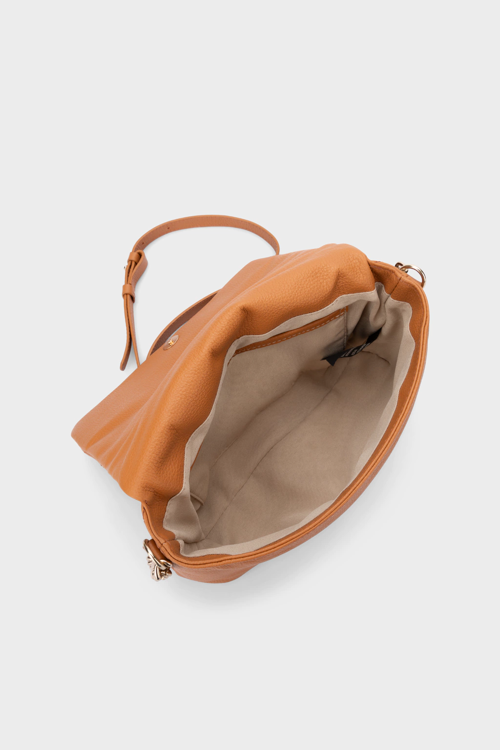 Descrição: Bolsa tiracolo média em couro caramelo. O modelo tem formato retangular em construção puffy médio, possui um bolso grande interno e bolso externo na parte de trás.