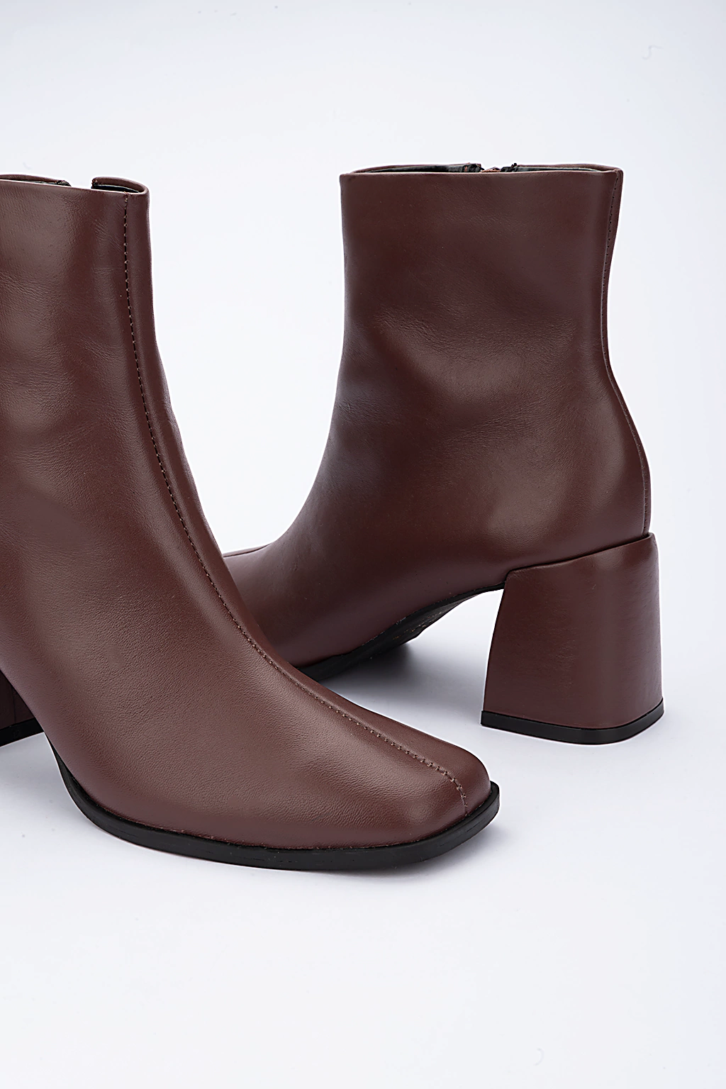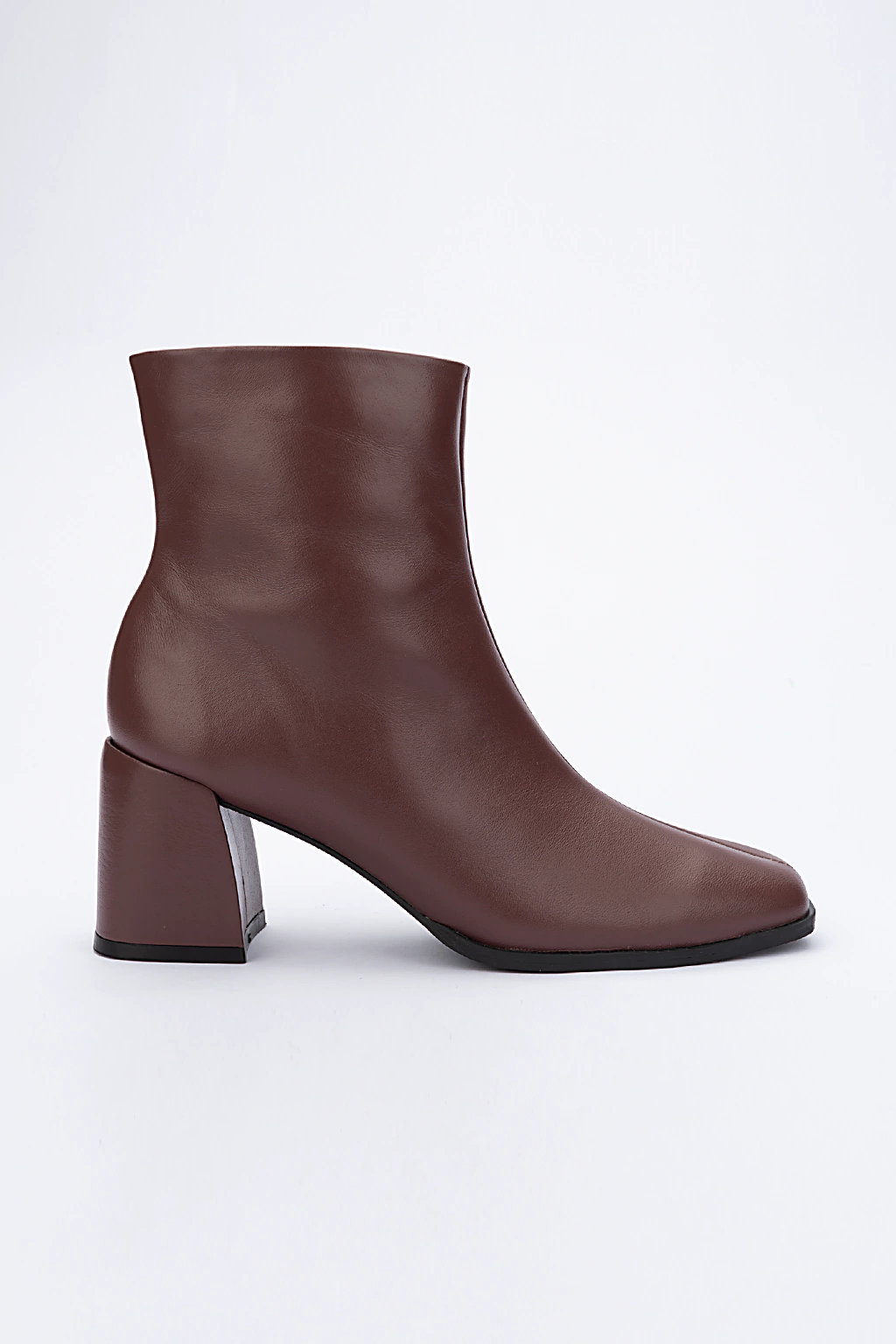 Bota em couro macio na cor Cabernet, toda forrada, cano baixo, bico quadrado, sola na parte da frente em borracha, salto bloco médio e fechamento com zíper.