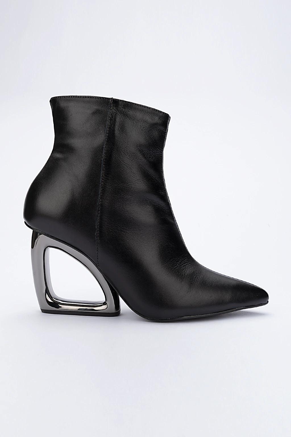 Bota em couro preta, salto metálico onix vazado, cano curto, bico fino e fechamento com zíper.