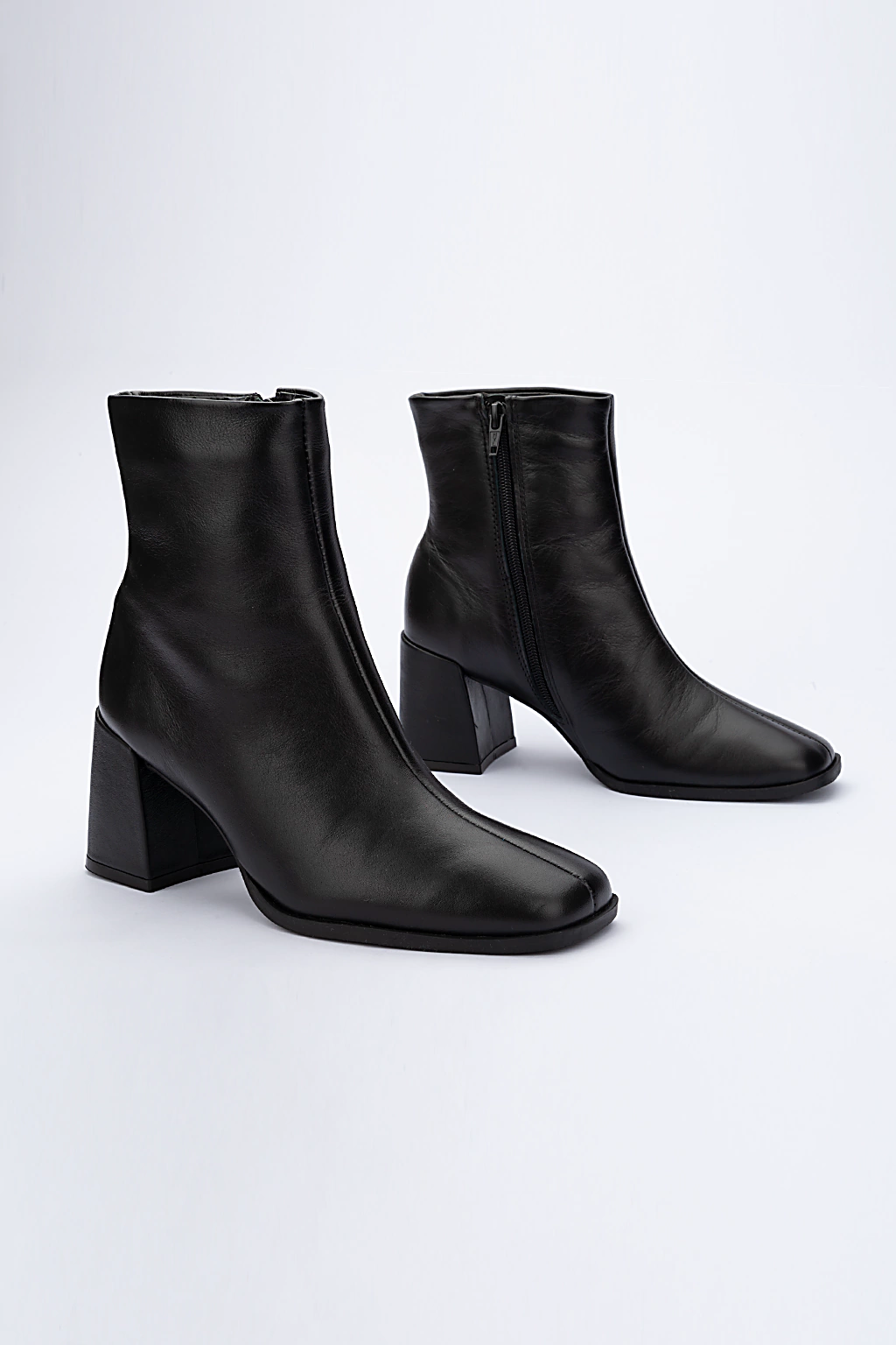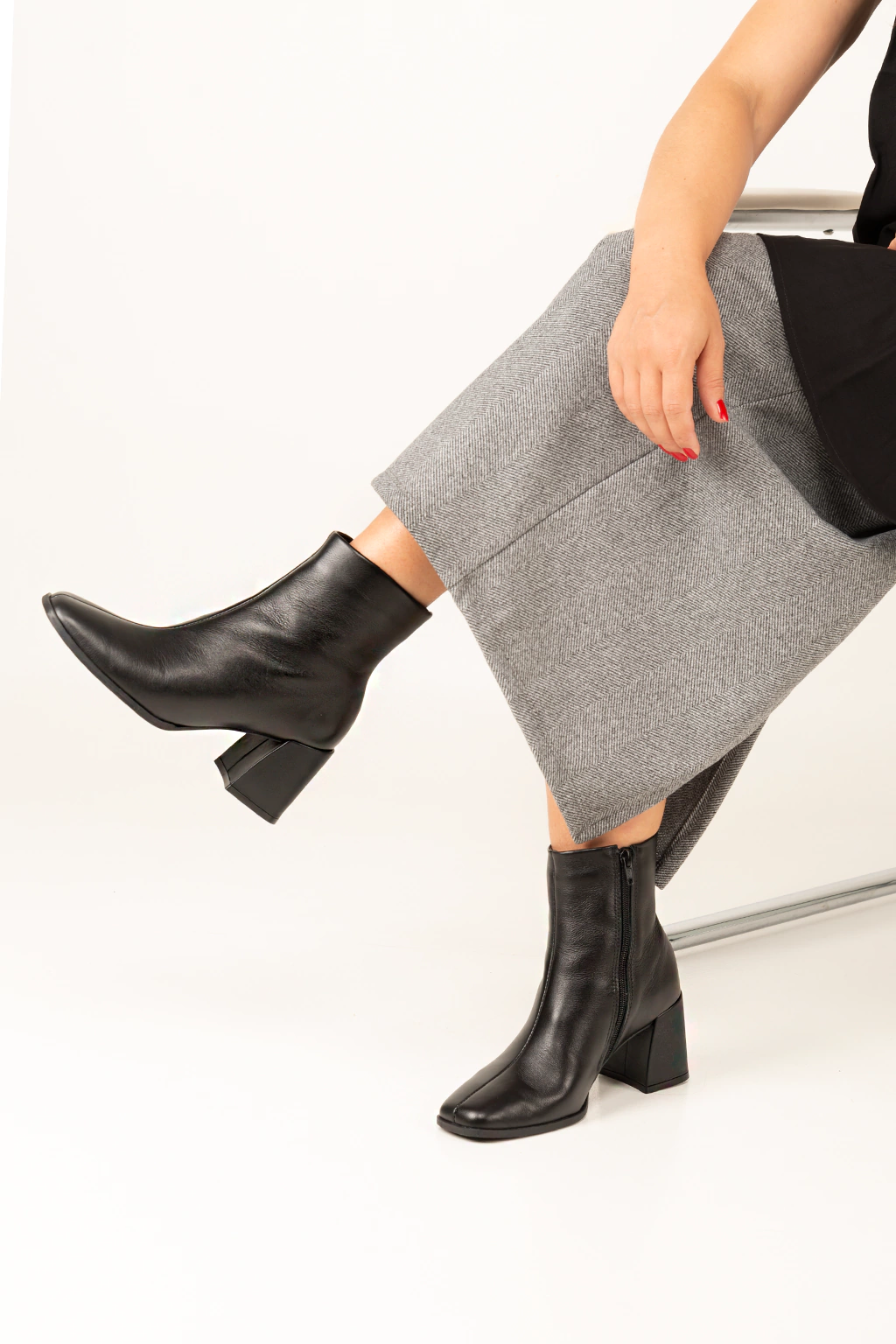 Bota em couro macio na cor preta, toda forrada, cano baixo, bico quadrado, sola na parte da frente em borracha, salto bloco médio e fechamento com zíper.