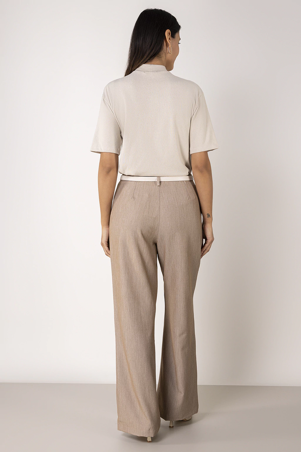 A calça é confeccionada em alfaiataria, modelagem reta, possui um pouco de elasticidade, na cor mescla capuccino, fechamento com zíper, possui passantes e bolsos funcionais frontais.