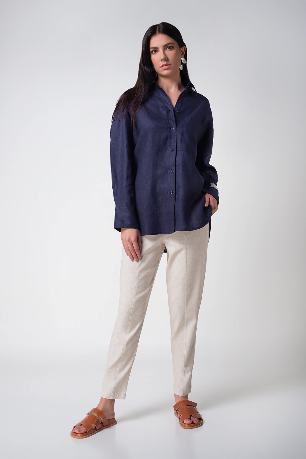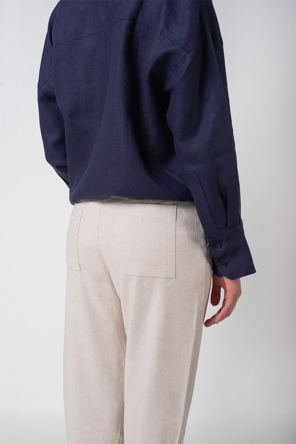 Confeccionado em viscose e linho, na cor natural do linho, possui elasticidade, fechamento com zíper e botão, na parte frontal bolsos faca e na parte de trás bolsos quadrados, passantes para cinto, possui forro. Composição do Tecido: 68% viscose 30% linho 2% elastano – Forro: 100% poliéster