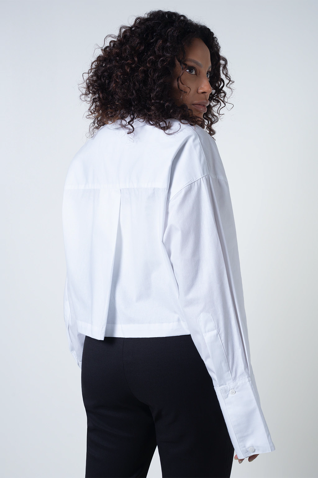 Confeccionada em tecido puro Algodão Tricoline, na cor branca, modelagem cropped amplo, fechamento com botões e bolso frontal, manga longa com acabamento em dobra, nas costas detalhe de prega e levemente mais comprida. Composição do Tecido: 100% Algodão