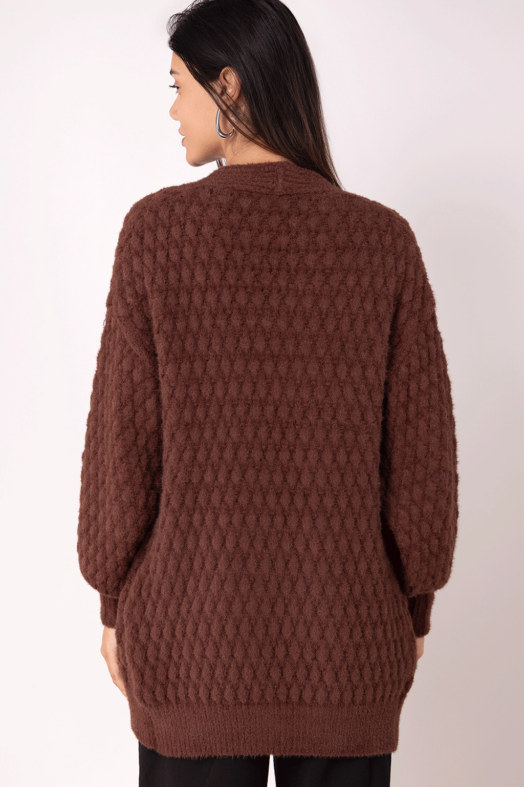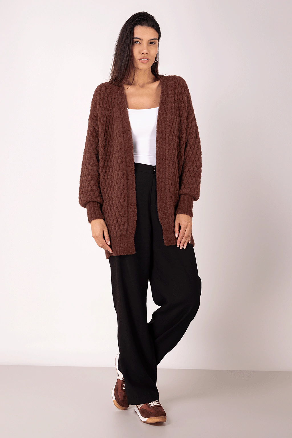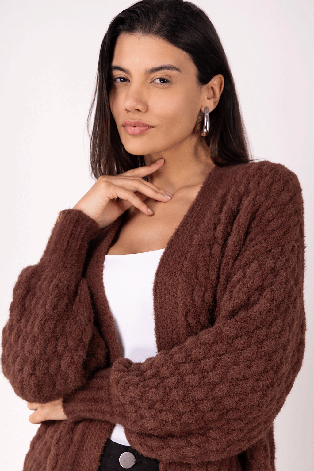 Uma opção versátil e charmosa para você compor seus looks invernais, sem falar na cor marrom que é hit da temporada. Com modelagem alongada, mangas bufantes e o tecimento do ponto deixam a peça imponente e compõe diversas produções. Quentinho e aconchegante, graças ao fio pluma que é extremamente macio. Para completar combine com nossa calça alfaiataria preta, nosso body e nosso tênis marrom, compondo um look estiloso e descomplicado.