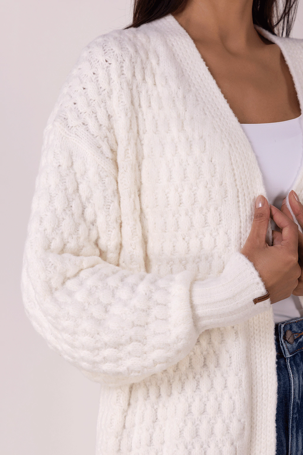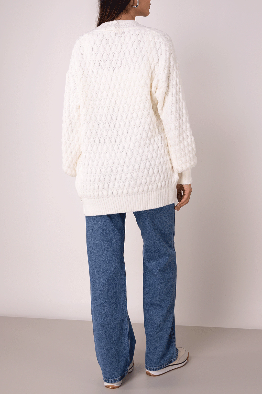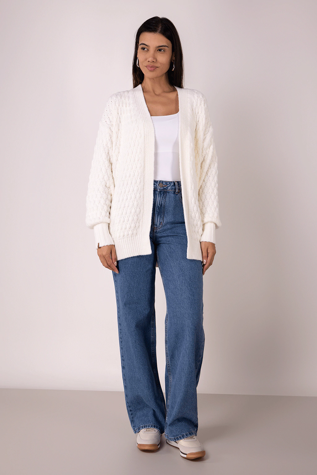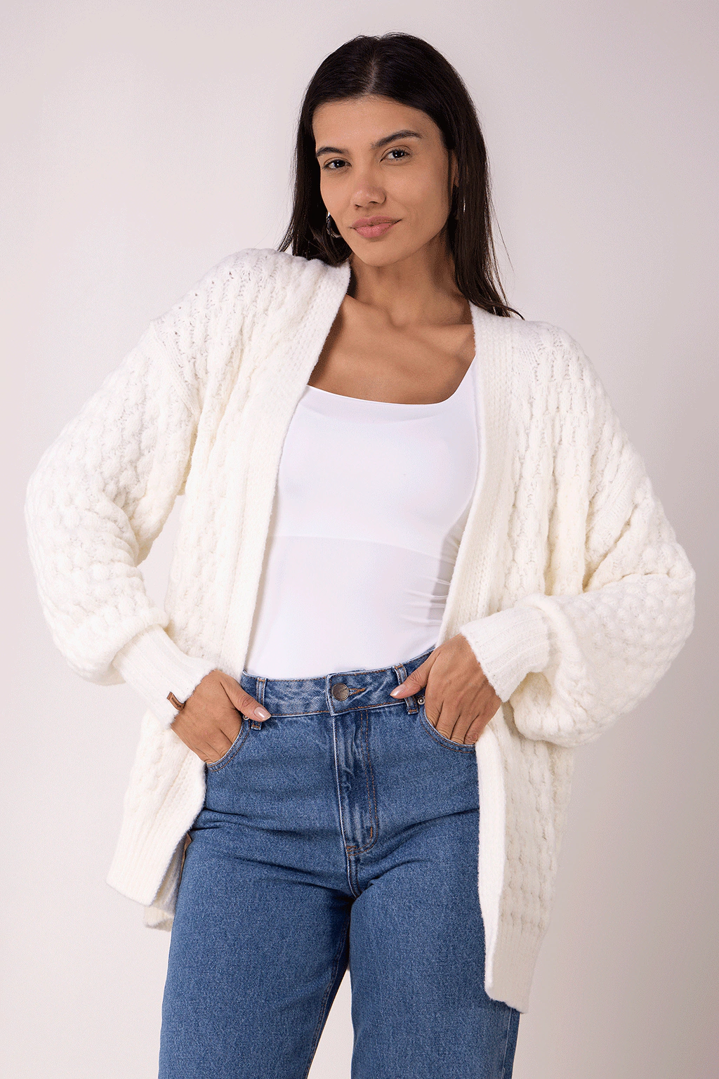 Uma opção versátil e charmosa para você compor seus looks invernais. O tom off white é atemporal e combina com diversas paletas de cores. Com modelagem alongada, mangas bufantes e o tecimento do ponto deixam a peça imponente e compõe diversas produções. Quentinho e aconchegante, graças ao fio pluma que é extremamente macio. Nossa sugestão para um look comfy é combinar com nossa calça jeans wide leg, nosso body e nosso tênis off white. Para um look mais cool troque o jeans por uma calça de alfaiataria.