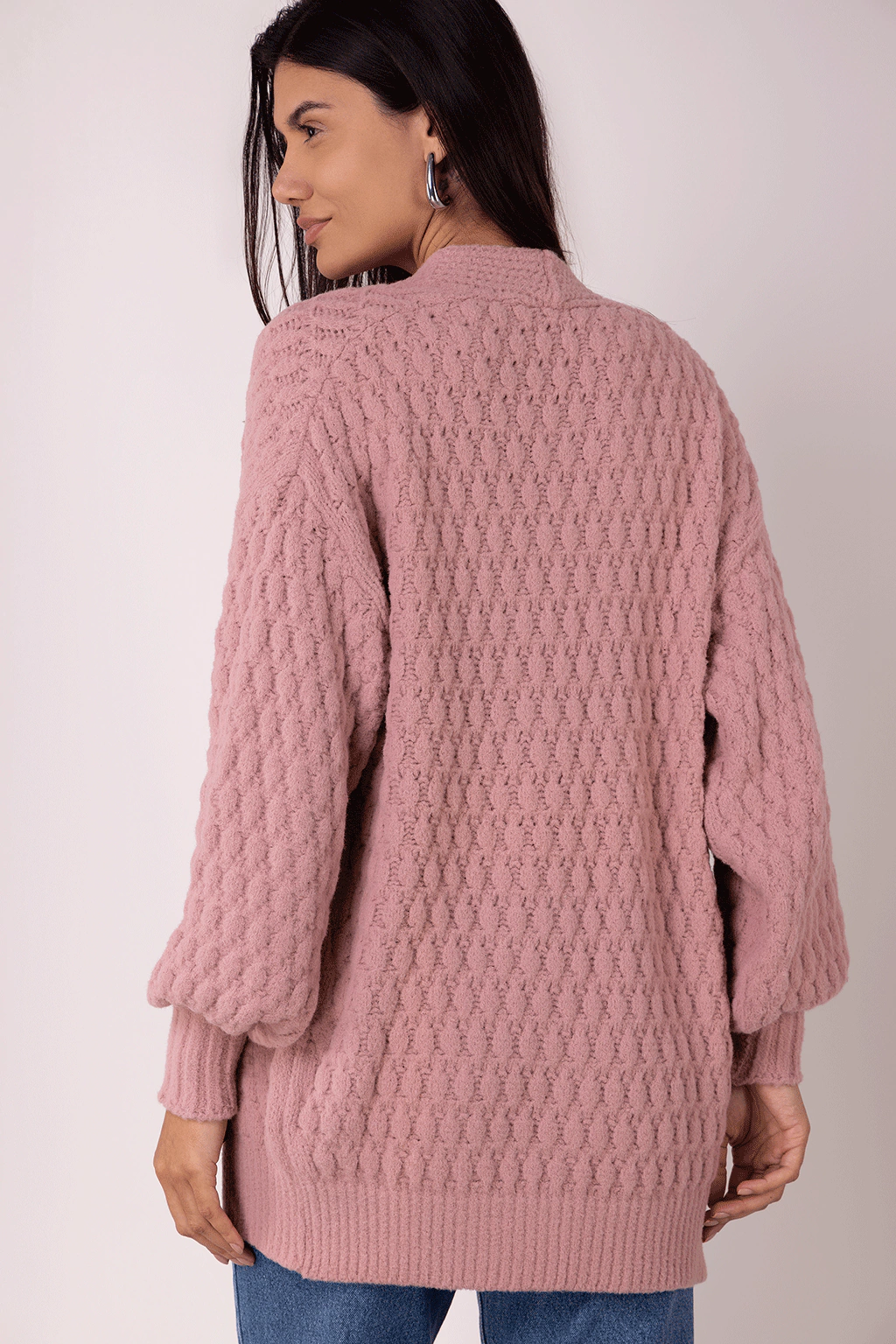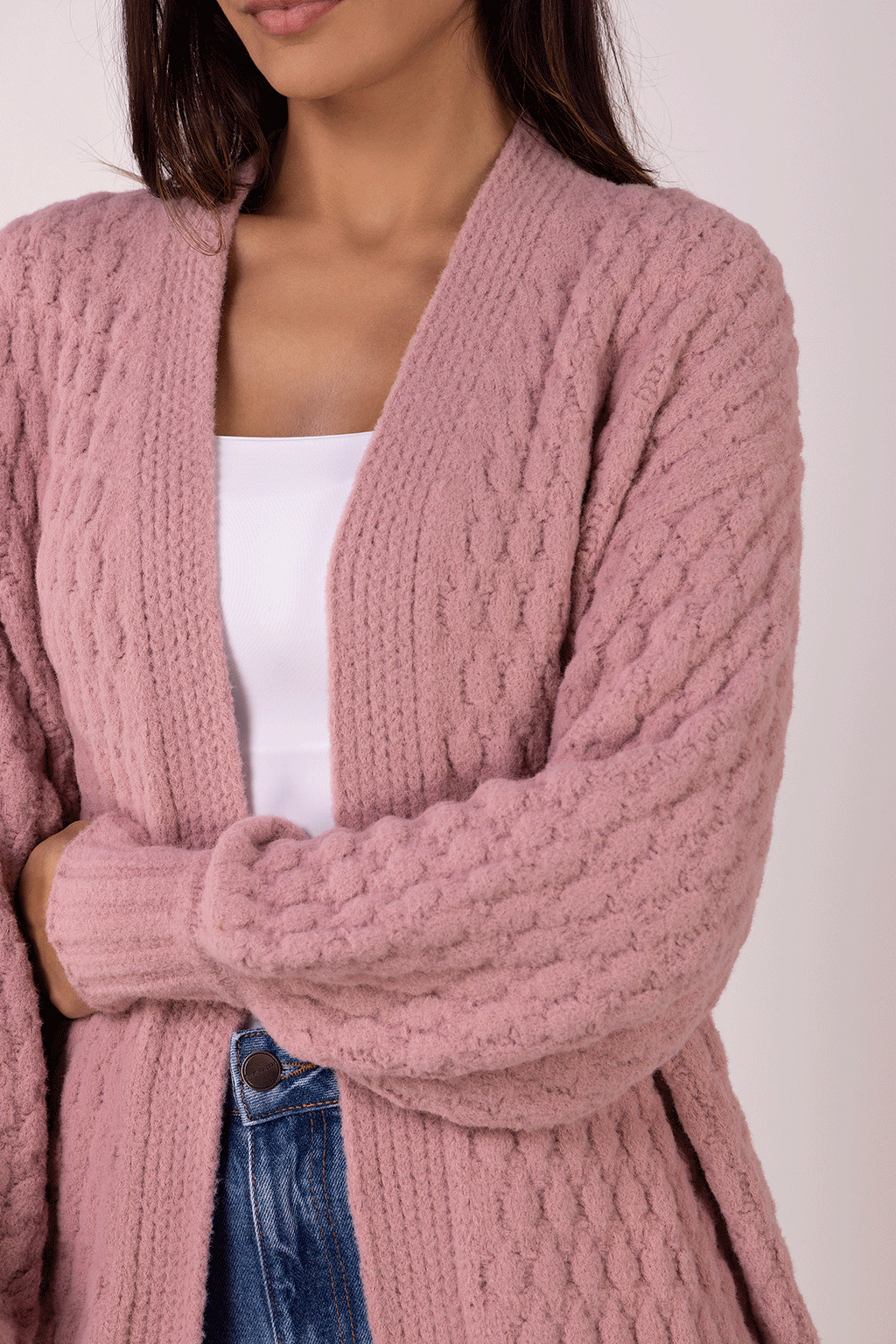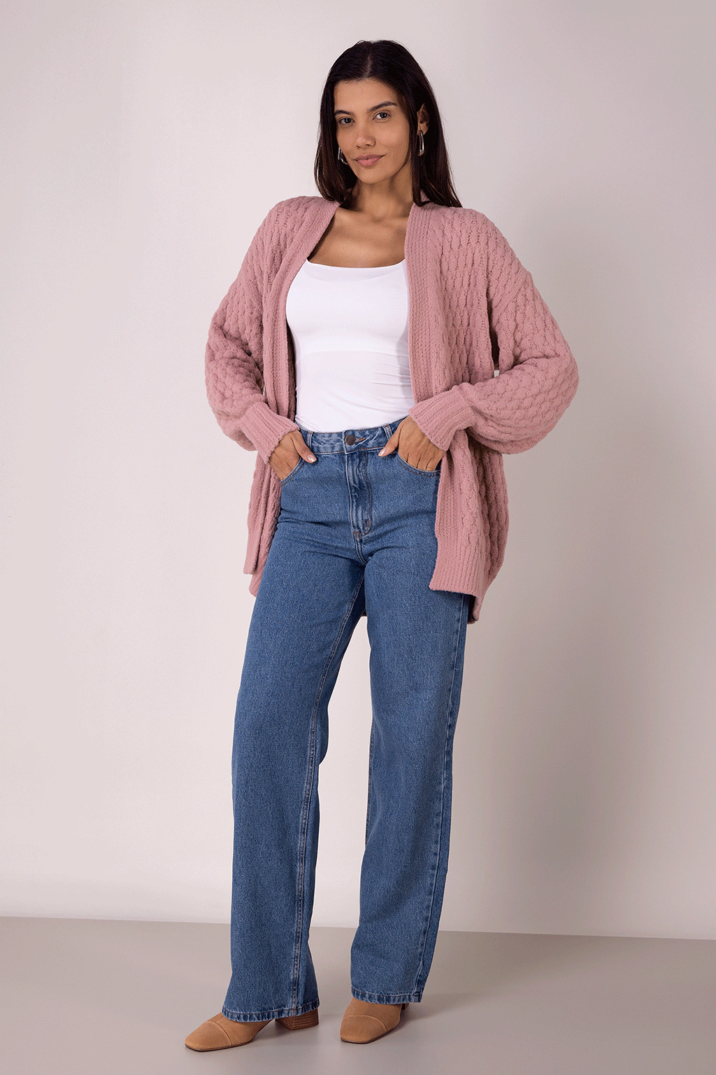 Uma opção versátil e charmosa para você compor seus looks invernais. O tom rosé é delicado e elegante, combinando com vários estilos pessoais. Com modelagem alongada, mangas bufantes e o tecimento do ponto deixam a peça imponente e compõe diversas produções. Quentinho e aconchegante, graças ao fio pluma que é extremamente macio. Para completar combine com nossa calça jeans wide leg, nosso body e nossa bota em camurça, compondo um look clássico e atemporal.
