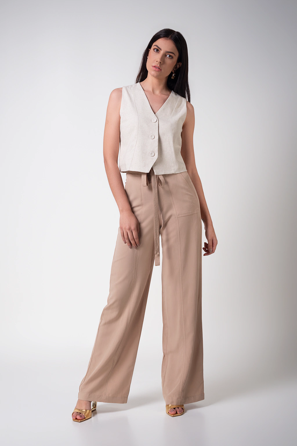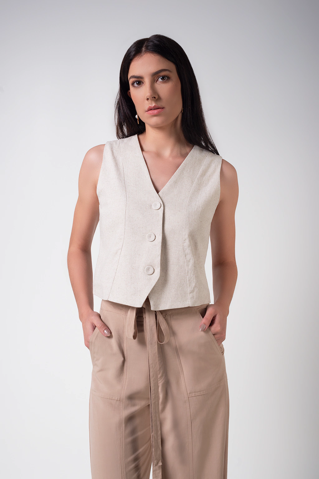 Confeccionado em tecido leve e toque macio, na cor natural, fechamento com botões forrados no mesmo tecido, possui um pouco de elasticidade, todo forrado. Composição do Tecido: 70% viscose 27% linho 3% elastano – Forro poliéster