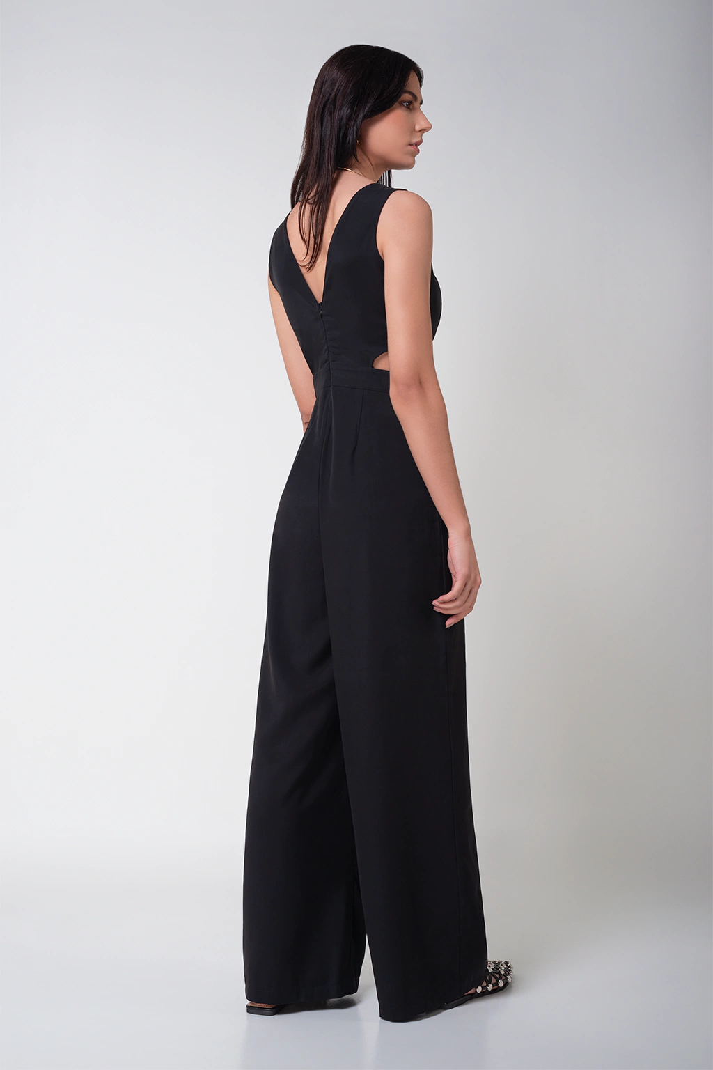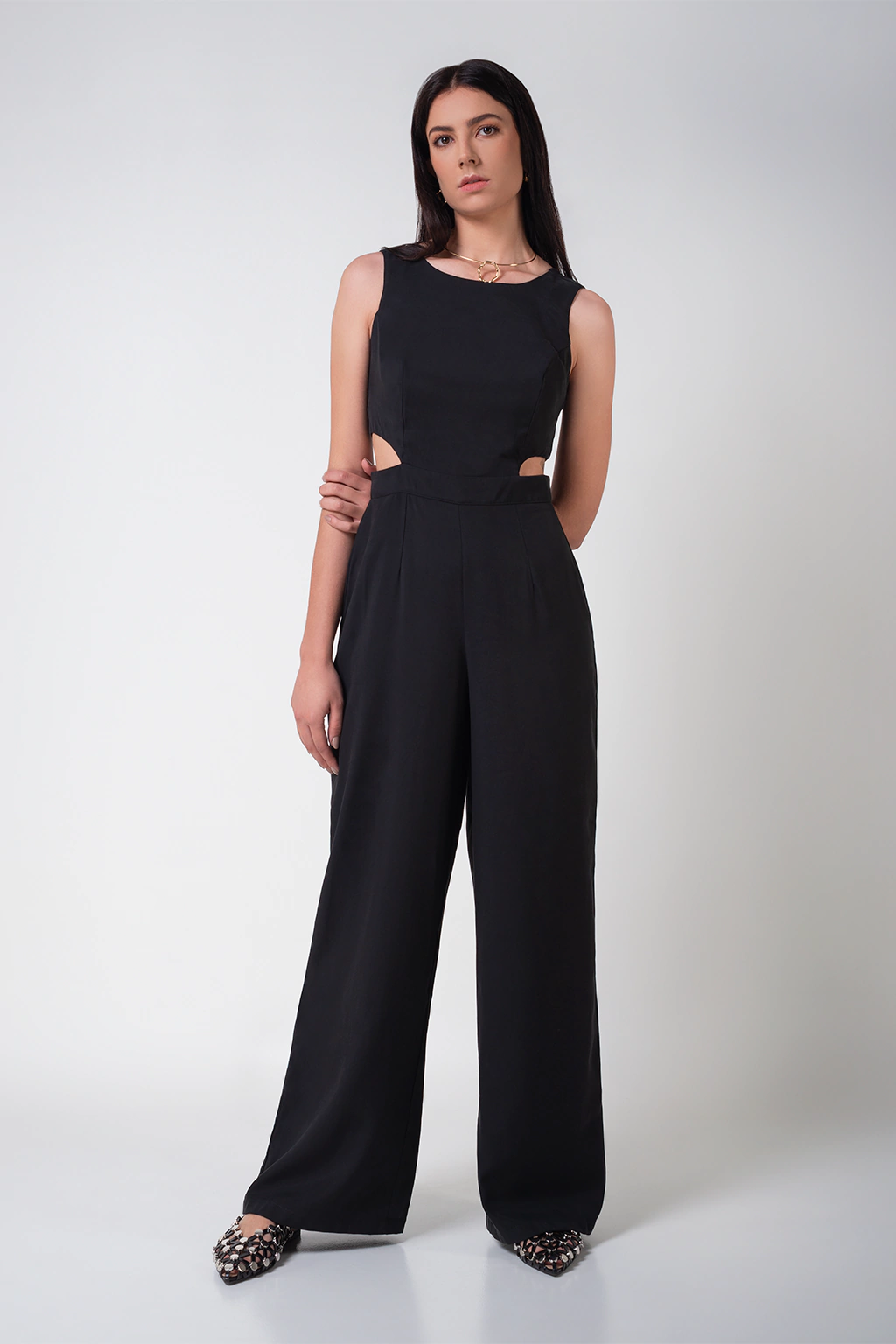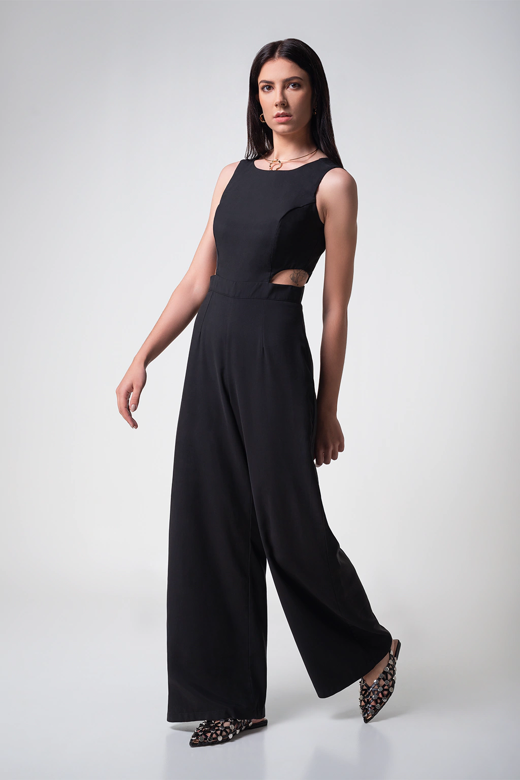 O macacão é confeccionado em tecido alfaiatado com toque macio, na cor preta, recortes assimétricos abaixo do busto com pele a mostra, possui caimento reto solto, comprimento longo, fechamento por zíper invisível nas costas. Composição do Tecido: 90% viscose 10% poliéster