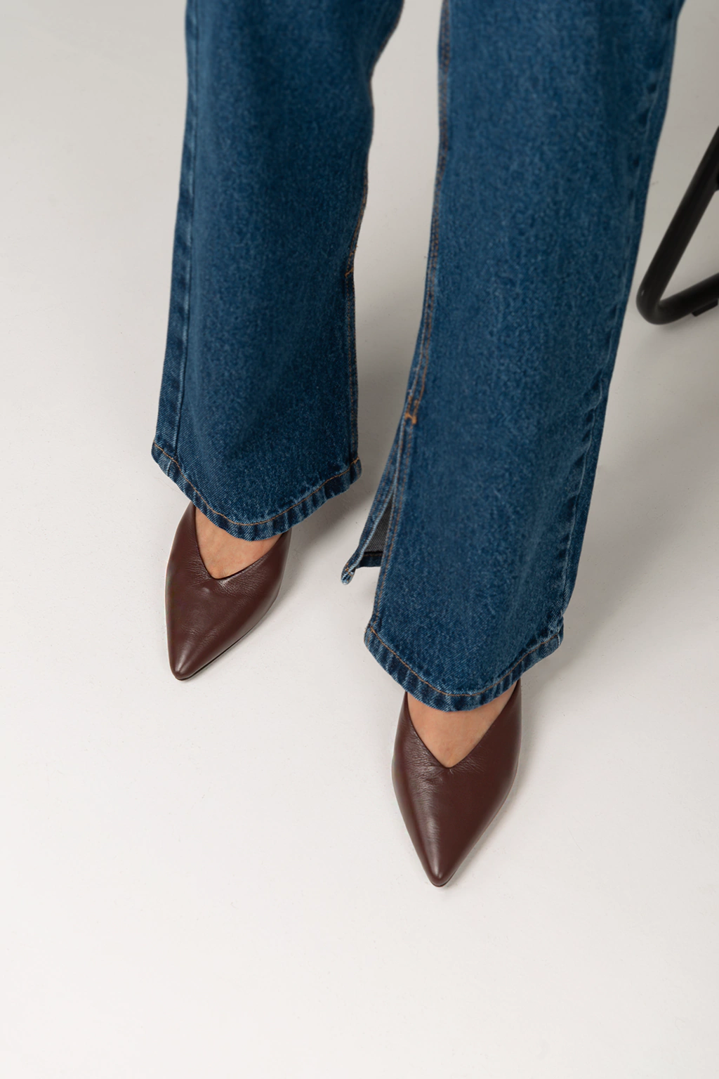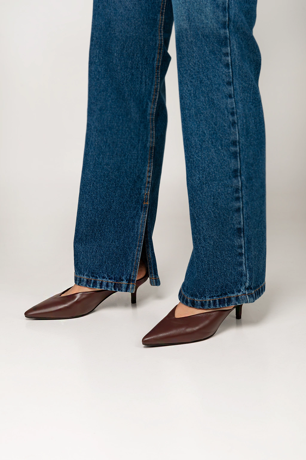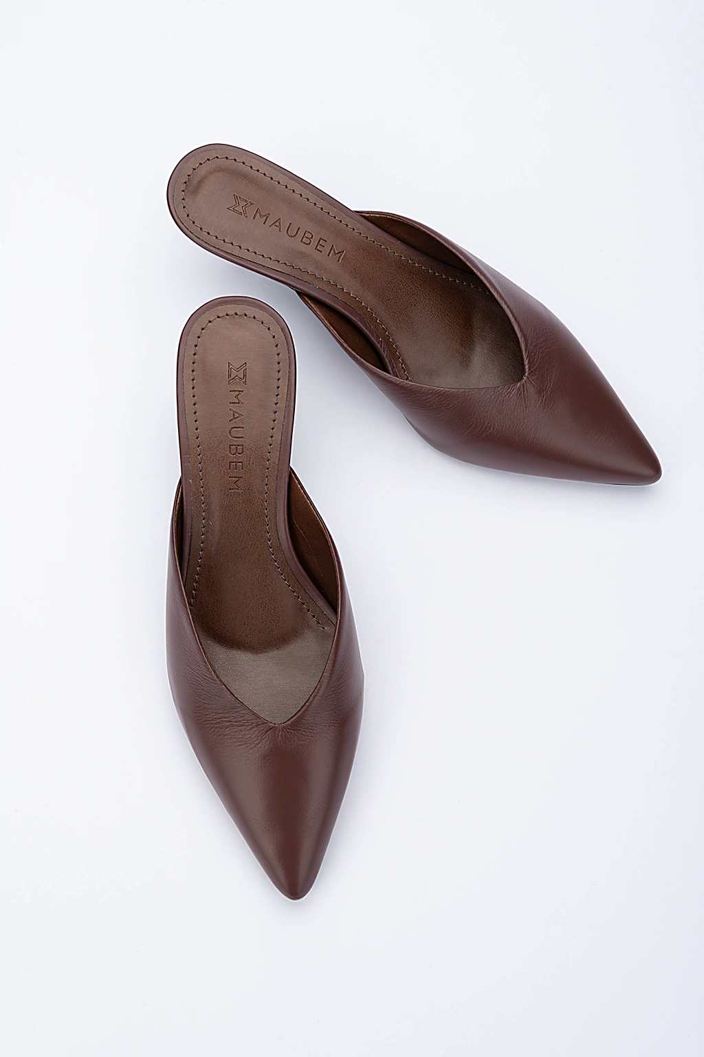 Mule Vinho Cabernet em couro, salto fino, bico fino e recorte em V no cabedal.