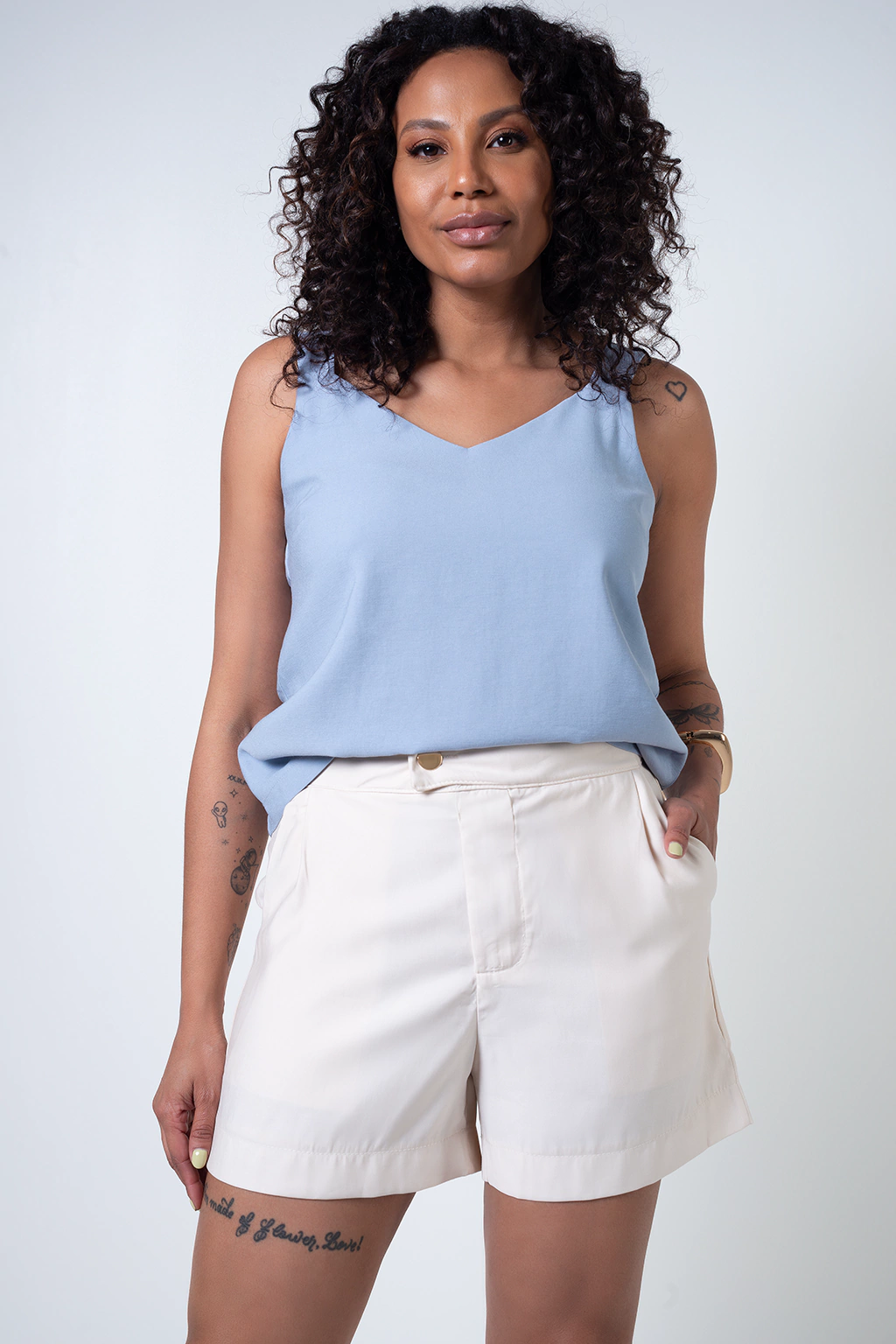 Confeccionado em tecido firme sem elasticidade com toque fresco, na cor azul oceano, modelagem soltinha, alças largas com 3cm, decote leve em formato V. Composição do Tecido: 92% viscose 8% poliéster
