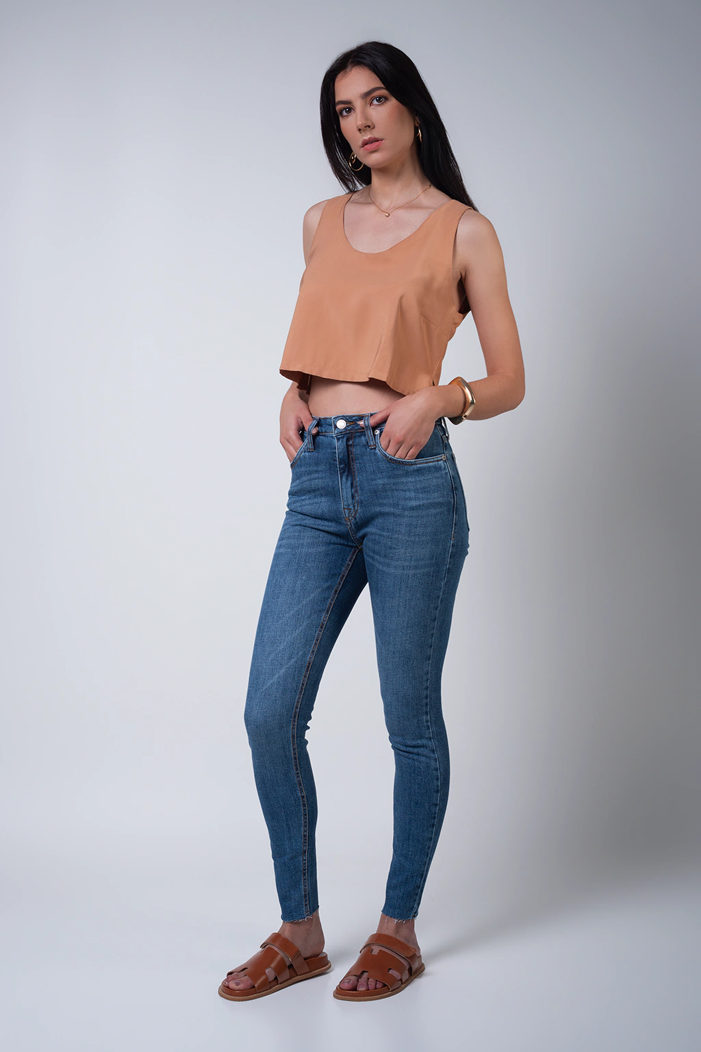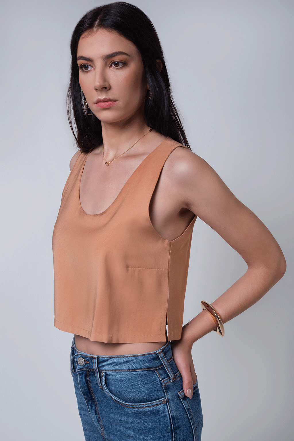 Confeccionado em tecido firme sem elasticidade com toque fresco, na cor caramelo, modelagem cropped soltinha, alças largas, decote redondo, pequenas fendas nas laterais. Composição do Tecido: 80% viscose 20% poliéster