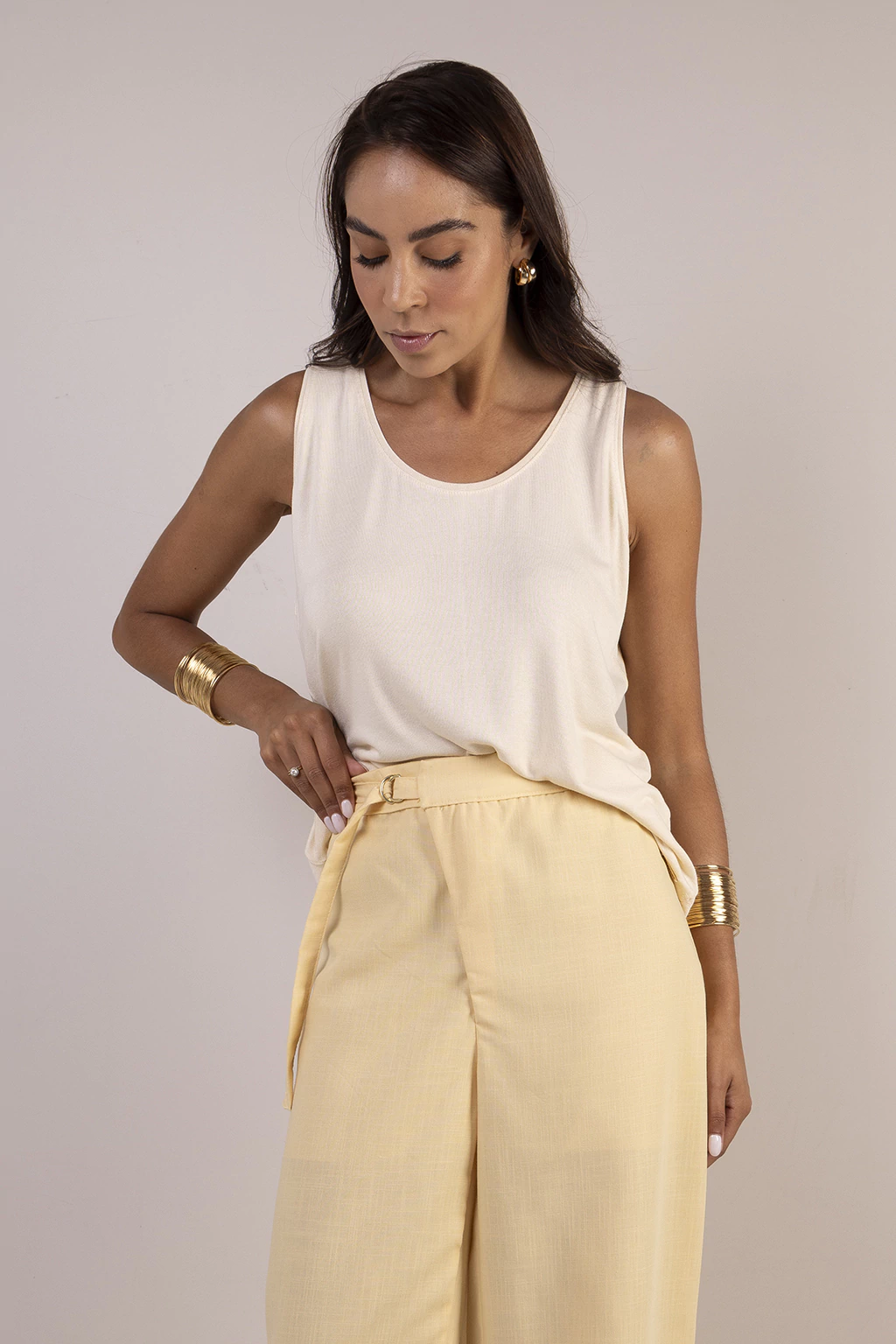 Versátil, a regata lisa é um item indispensável no armário feminino. Com ela você pode criar diversas composições, do casual até o mais cool. Sem contar nesse tom de amarelo manteiga, hit da temporada.