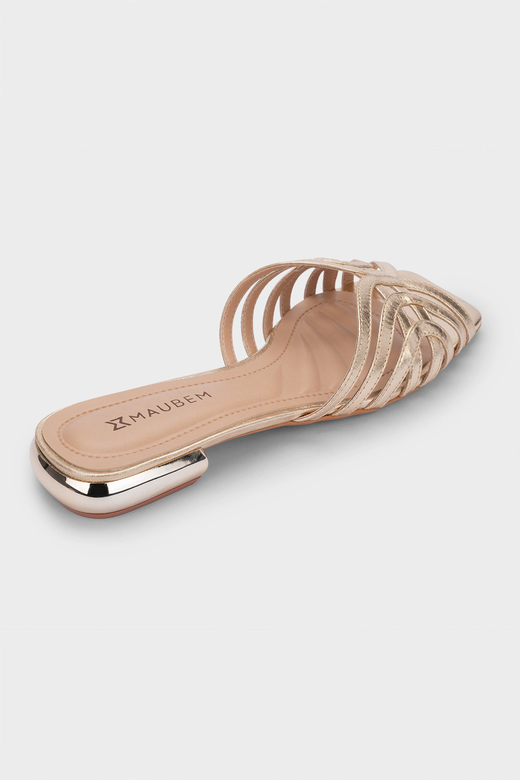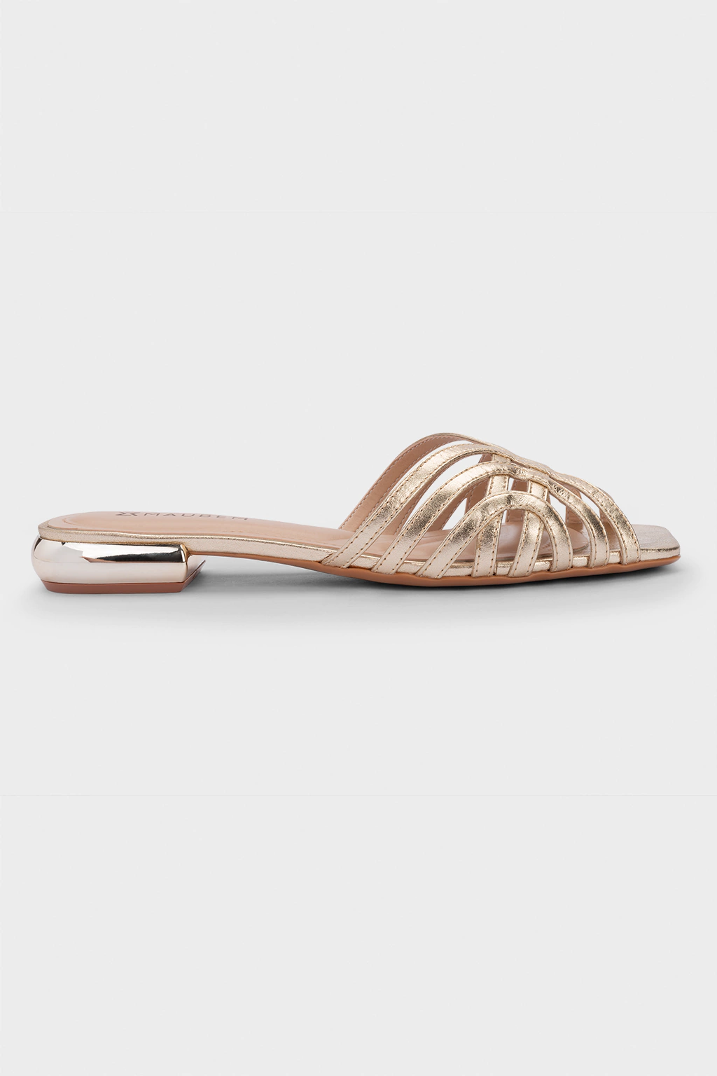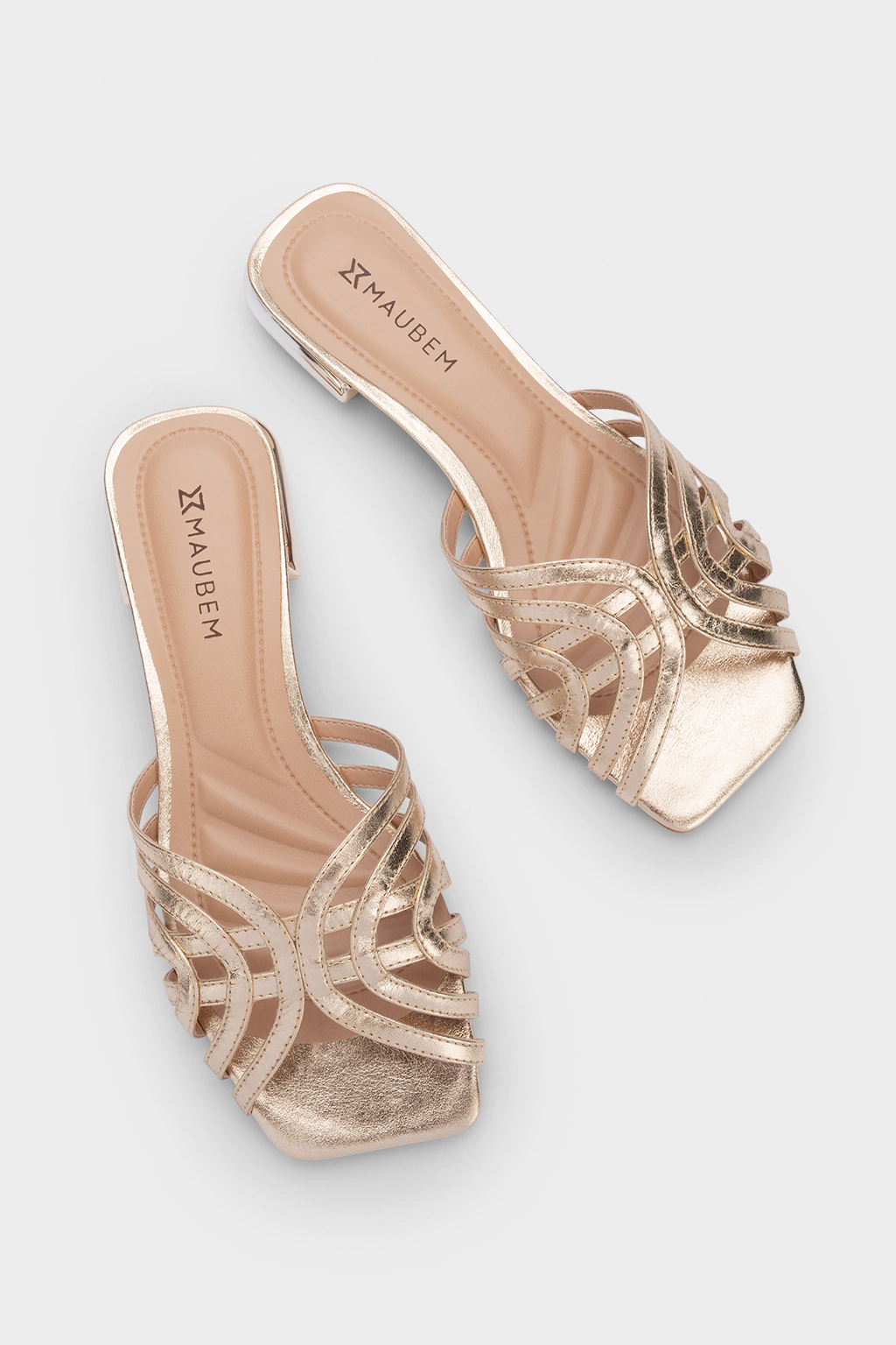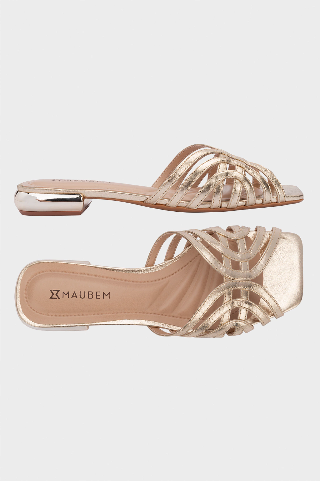 Sandália rasteira em couro dourado, salto metalizado, bico quadrado, palmilha conforto e cabedal com tira única com recortes.