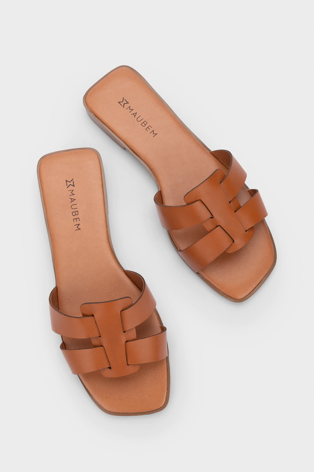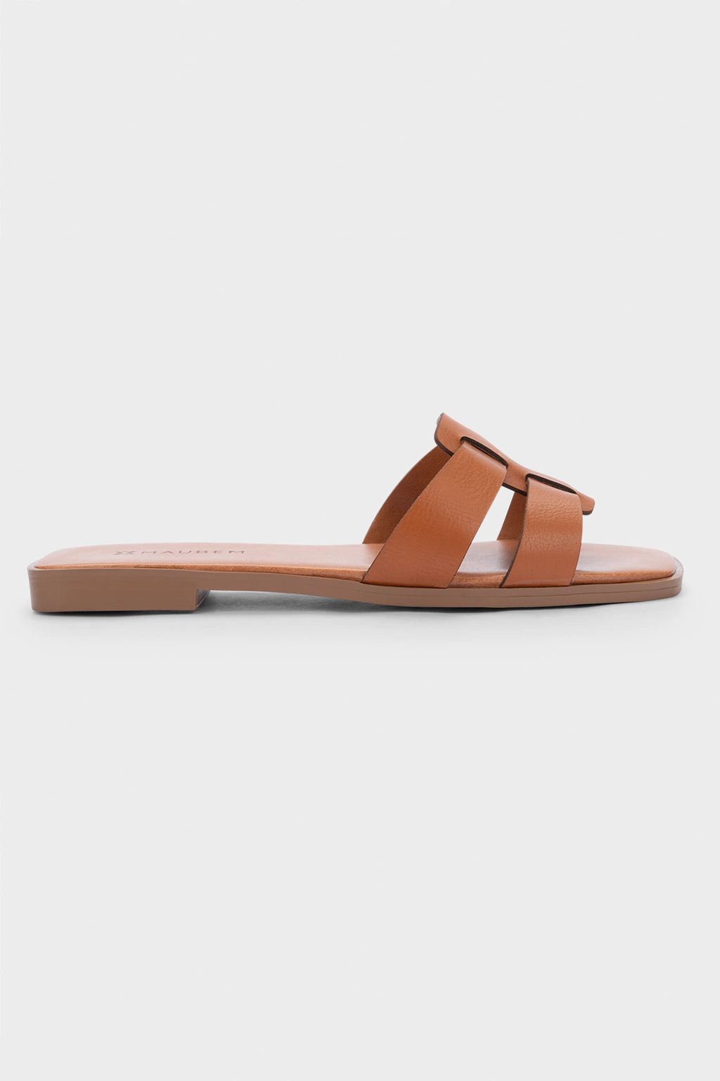 Sandália rasteira em couro marrom, sola rasteira, bico e calcanhar quadrados e cabedal com tira única com recortes.