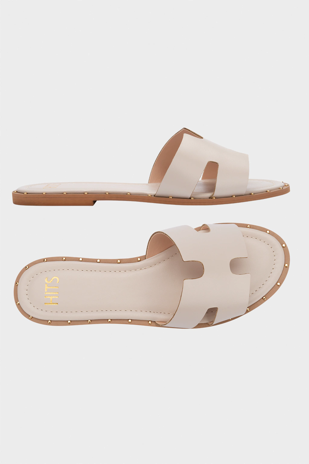 Sandália rasteira em couro off white, sola com aplicação de taxas douradas e cabedal com tira única com recortes.