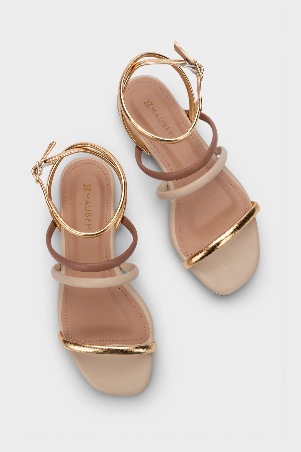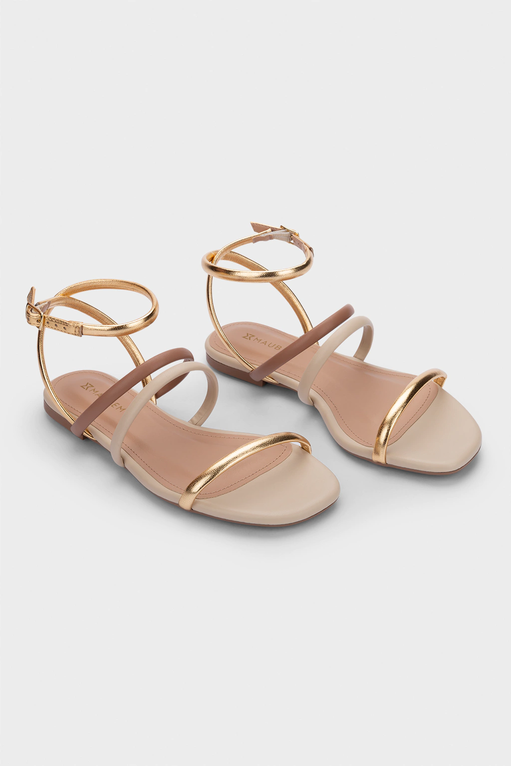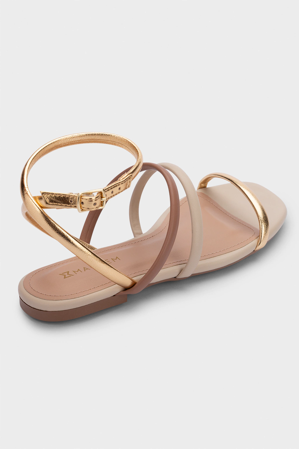 Sandália rasteira flat, cabedal em um mix de tiras em tons neutros, palmilha macia e tiras cruzadas afivelada no tornozelo.