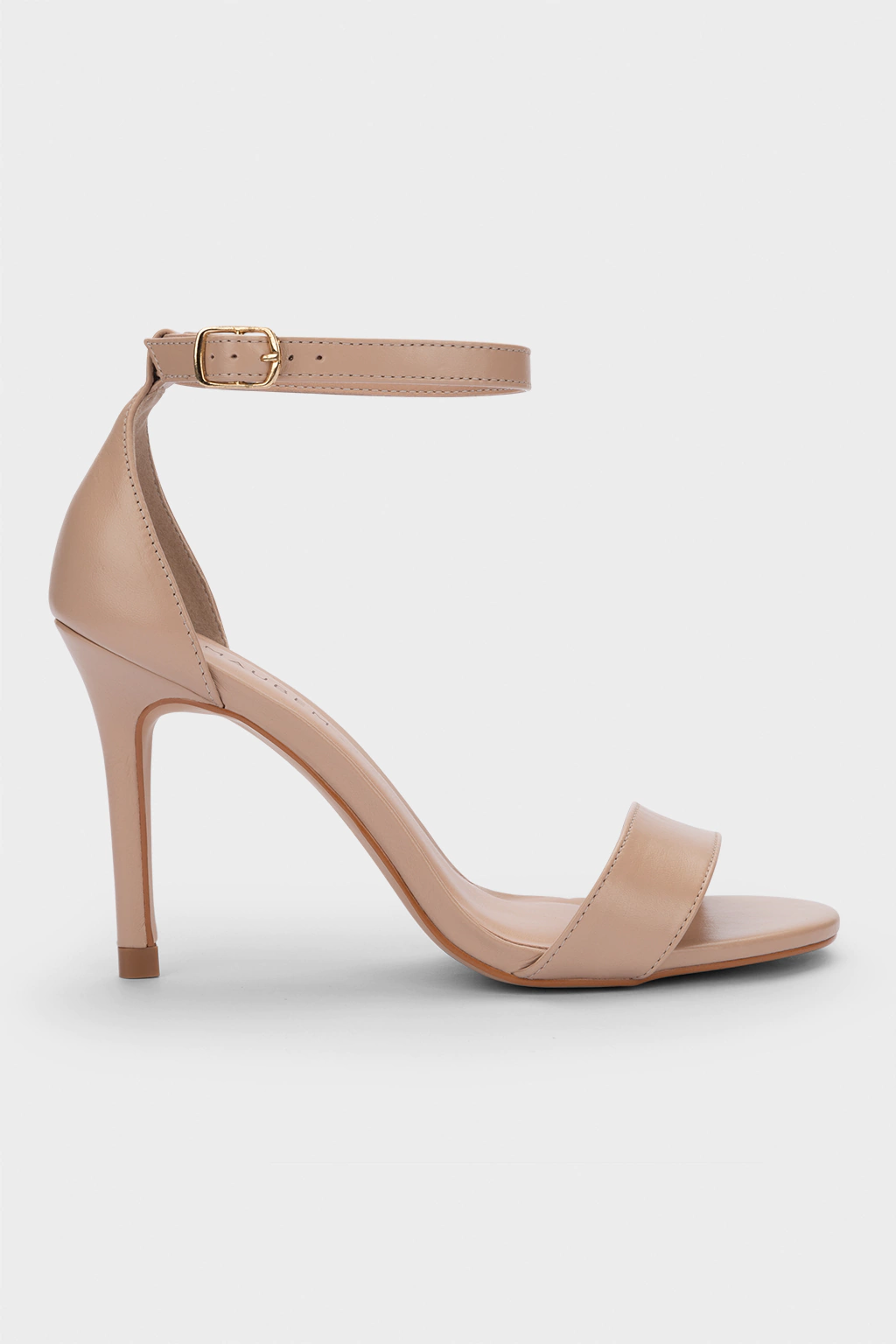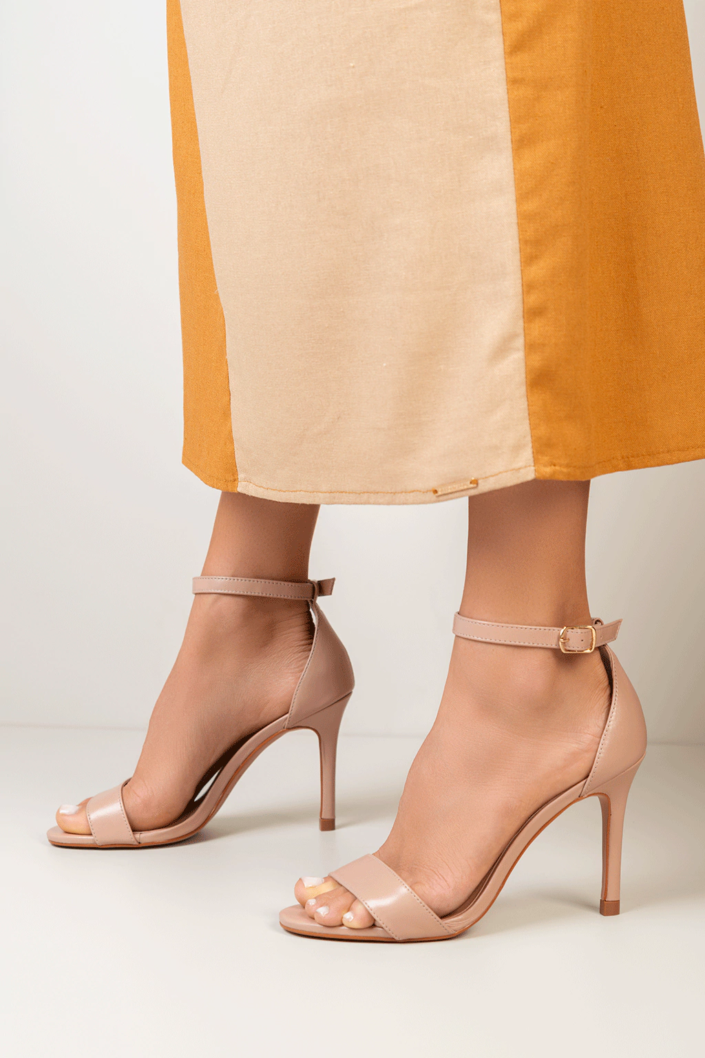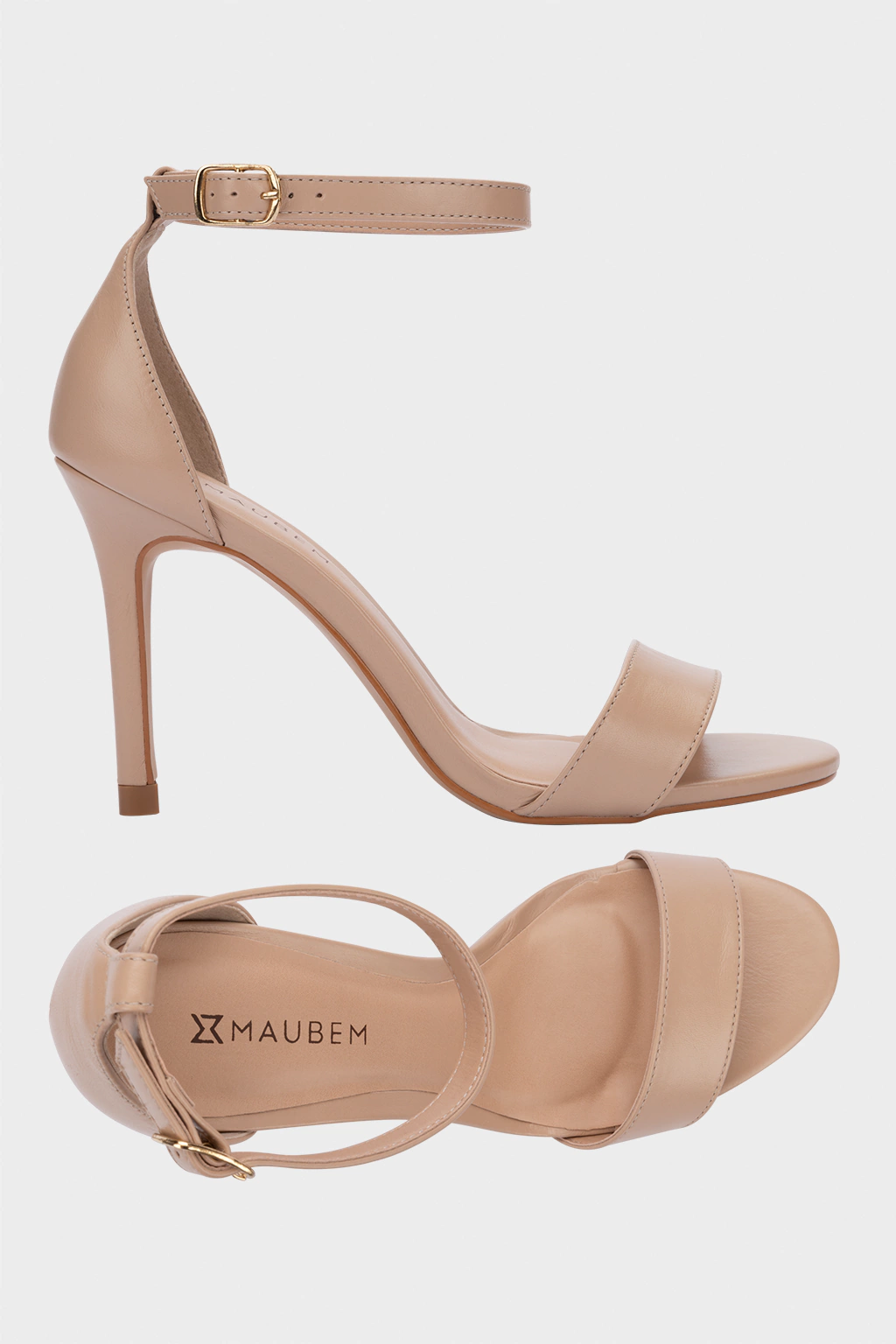 Sandália nude em couro, salto alto fino, cabedal em tira única, bico arredondado, fechada no calcanhar, possui tira em volta do tornozelo com fivela metálica para fechamento.