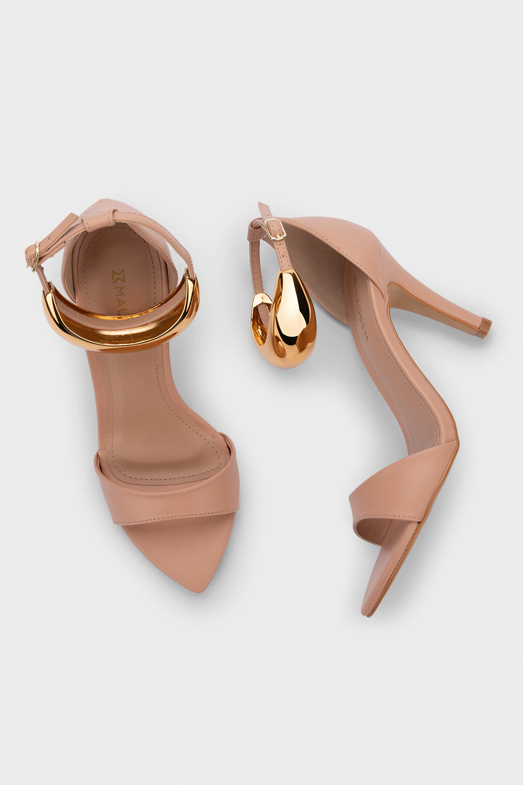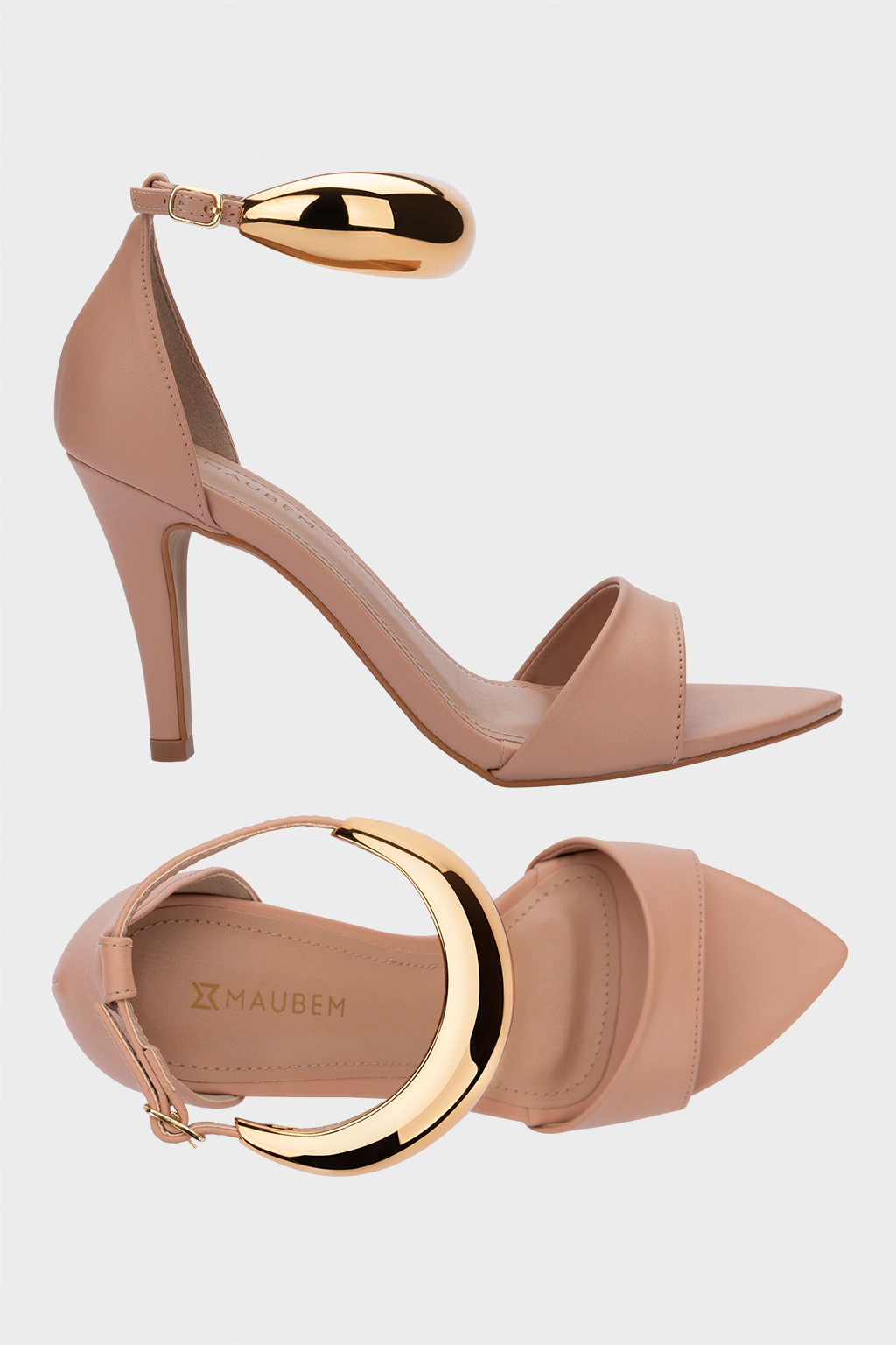 Sandália nude, salto fino, cabedal com tira única, fechada no calcanhar, possui tira fina em torno do tornozelo com aplicação de metal dourado removível, modelo de bico folha.