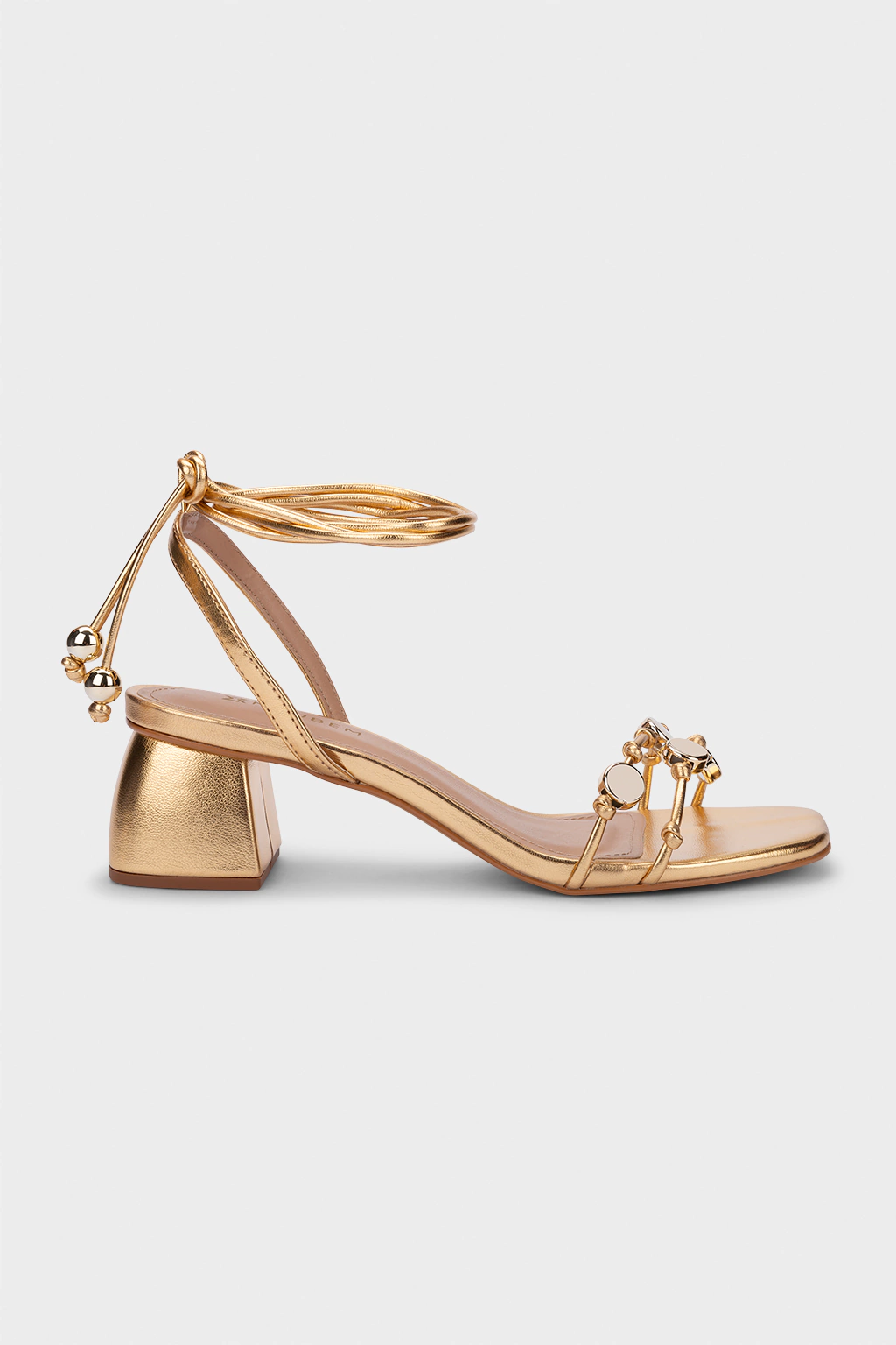 Sandália dourada, salto médio bloco, cabedal em tiras finas dourada com aplicação de adornos dourados, bico quadrado e fechamento por amarração.