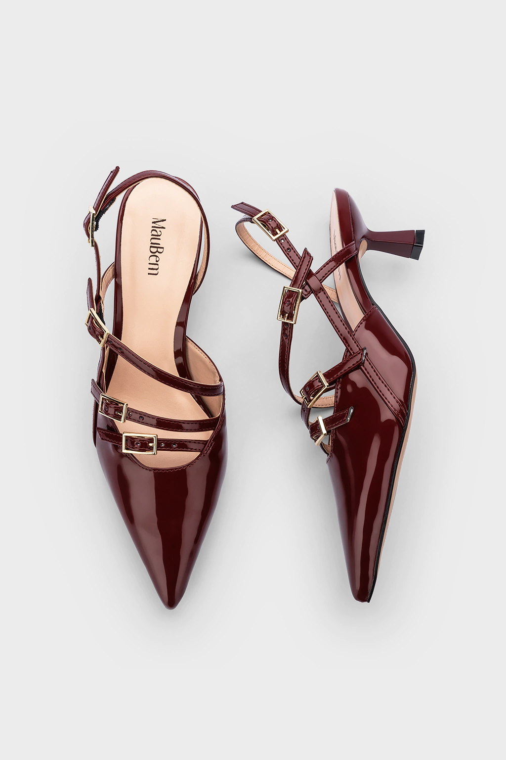 Descrição: Sapato bico fino scarpin slingback de salto fino com detalhe de tiras e fivelas na parte da frente. Tira traseira ajustável com fivela.