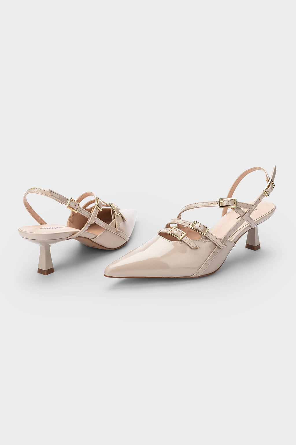 Um clássico renovado! O sapato de bico fino scarpin slingback está em alta, seguindo a tendência ele aparece em couro verniz com tiras delicadas com fivelas. Com salto baixo, kitten heel, alia estilo e conforto, ele é ótimo para dar um up nos looks, e transita bem entre várias ocasiões.