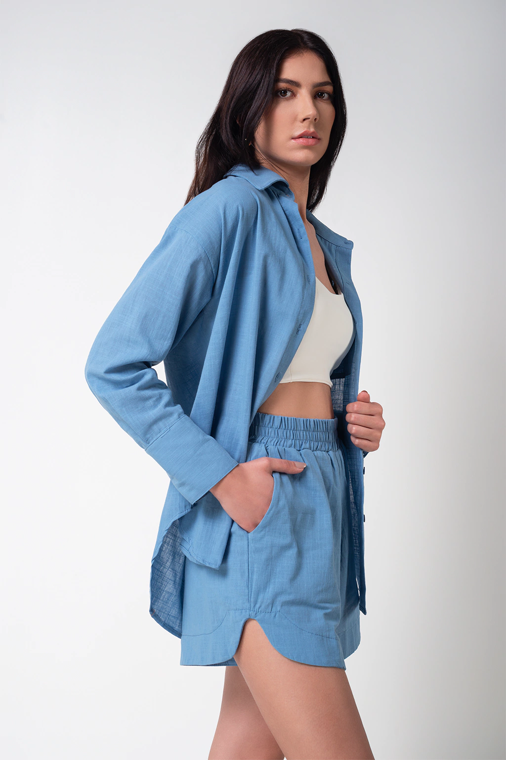 O short é confeccionado em algodão, na cor azul, modelagem soltinha, elástico na cintura, dois bolsos frontais funcionais, possui forro. Composição do Tecido: 100% algodão – Forro: 100% poliéster