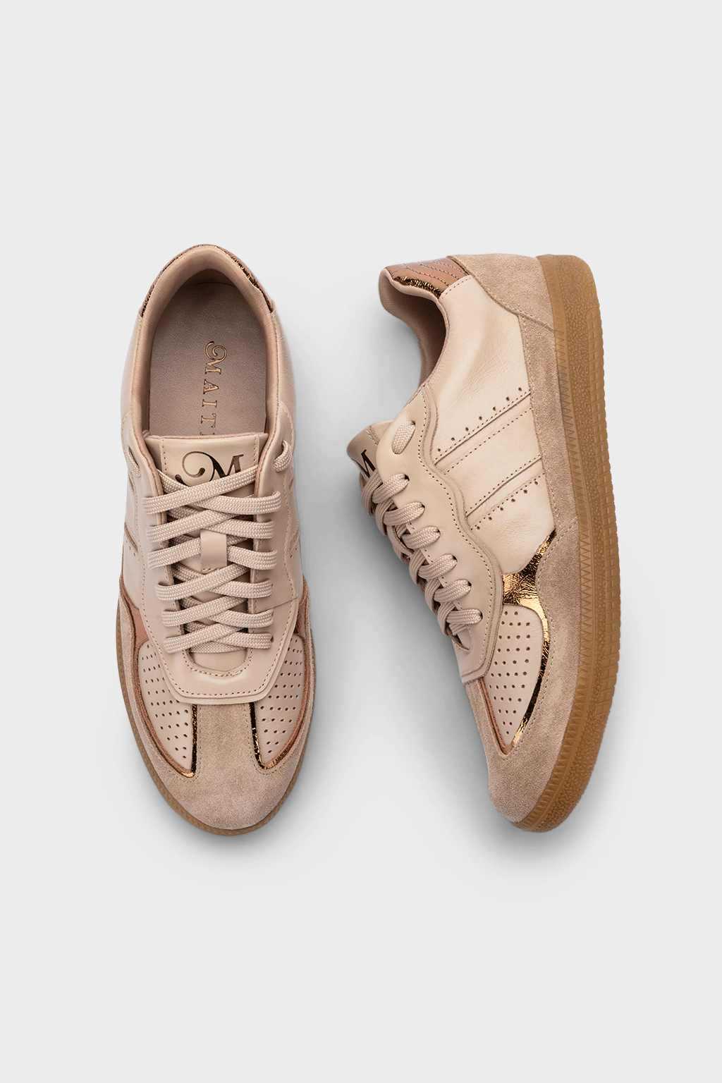 Descrição: Tênis casual 100% Couro e Camurça. O modelo possui recortes em couro Bege, camurça Bege e couro verniz bronze. Solado emborrachado e cadarços bege.
