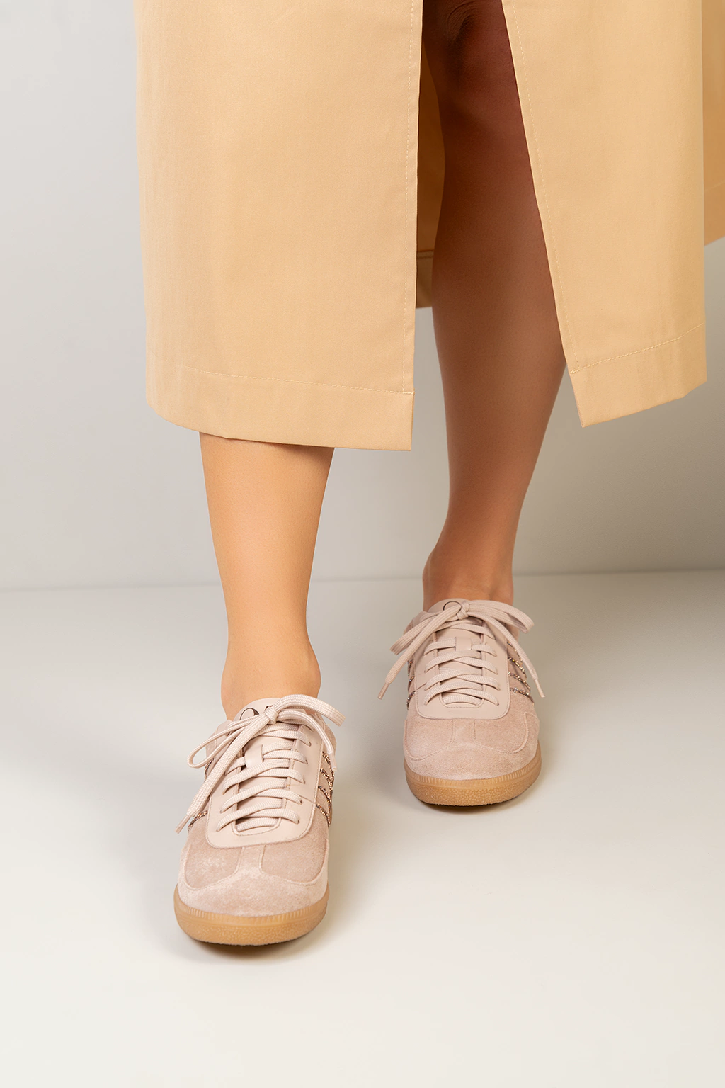 Descrição: Tênis casual 100% Couro Camurça. O modelo possui recortes em couro camurça Bege, couro Bege e quatro listras em strass. Solado emborrachado e cadarços bege.