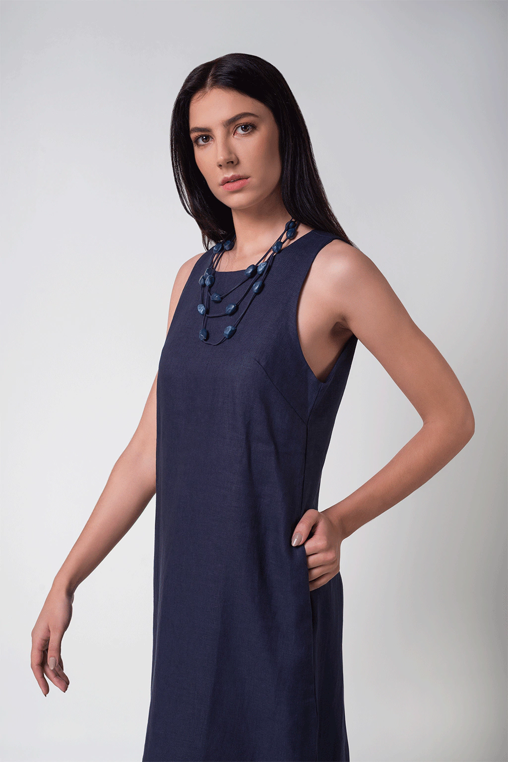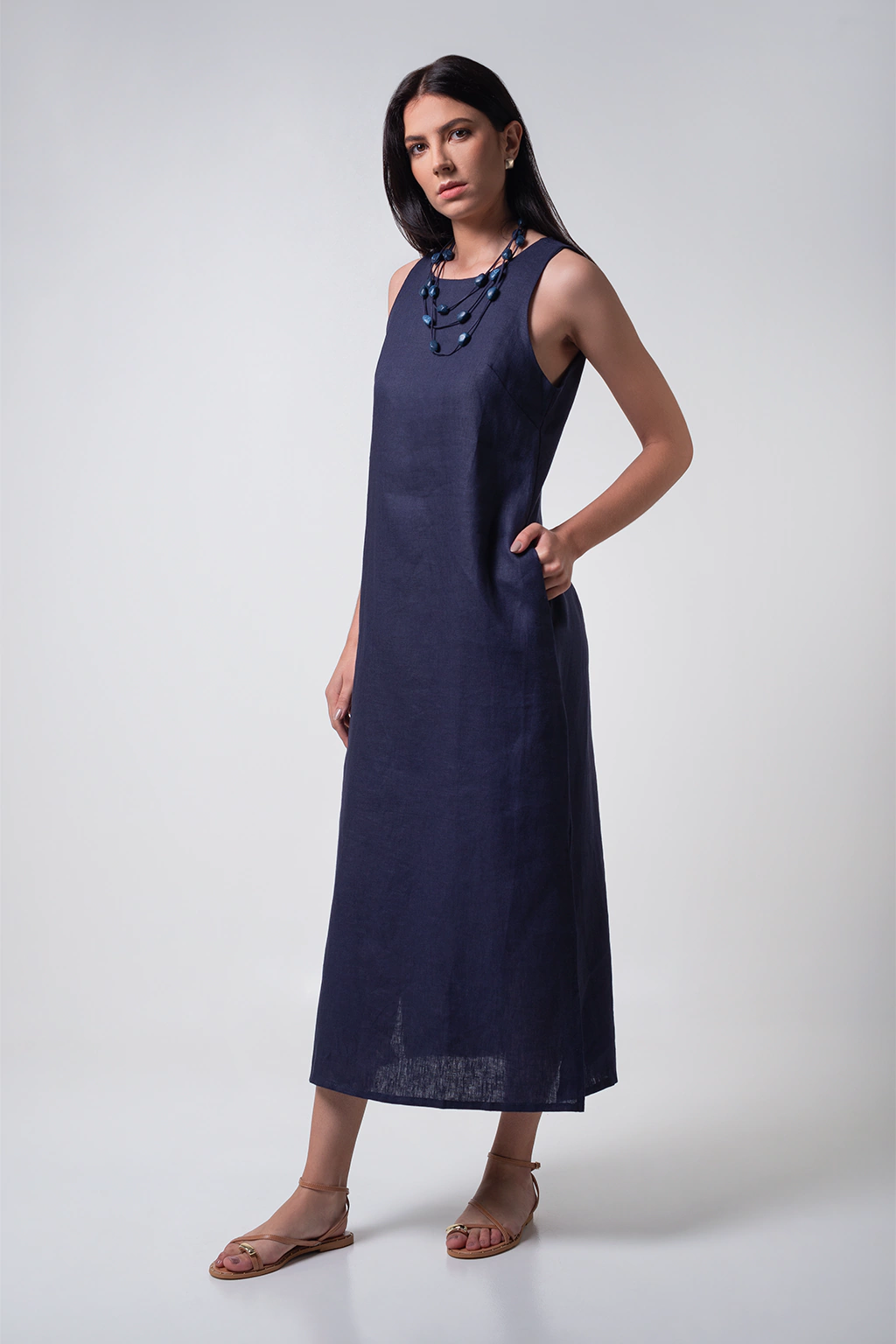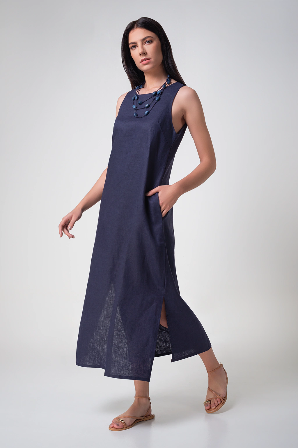 Vestido confeccionada em 100% Linho, na cor azul marinho, modelagem solta, comprimento midi com aberturas laterais e fechamento nas costas com botão na mesma cor da peça. Composição do Tecido: 100% linho