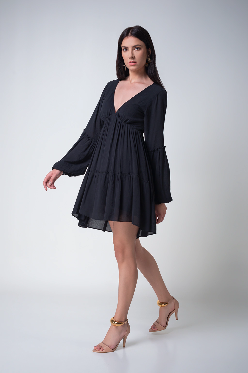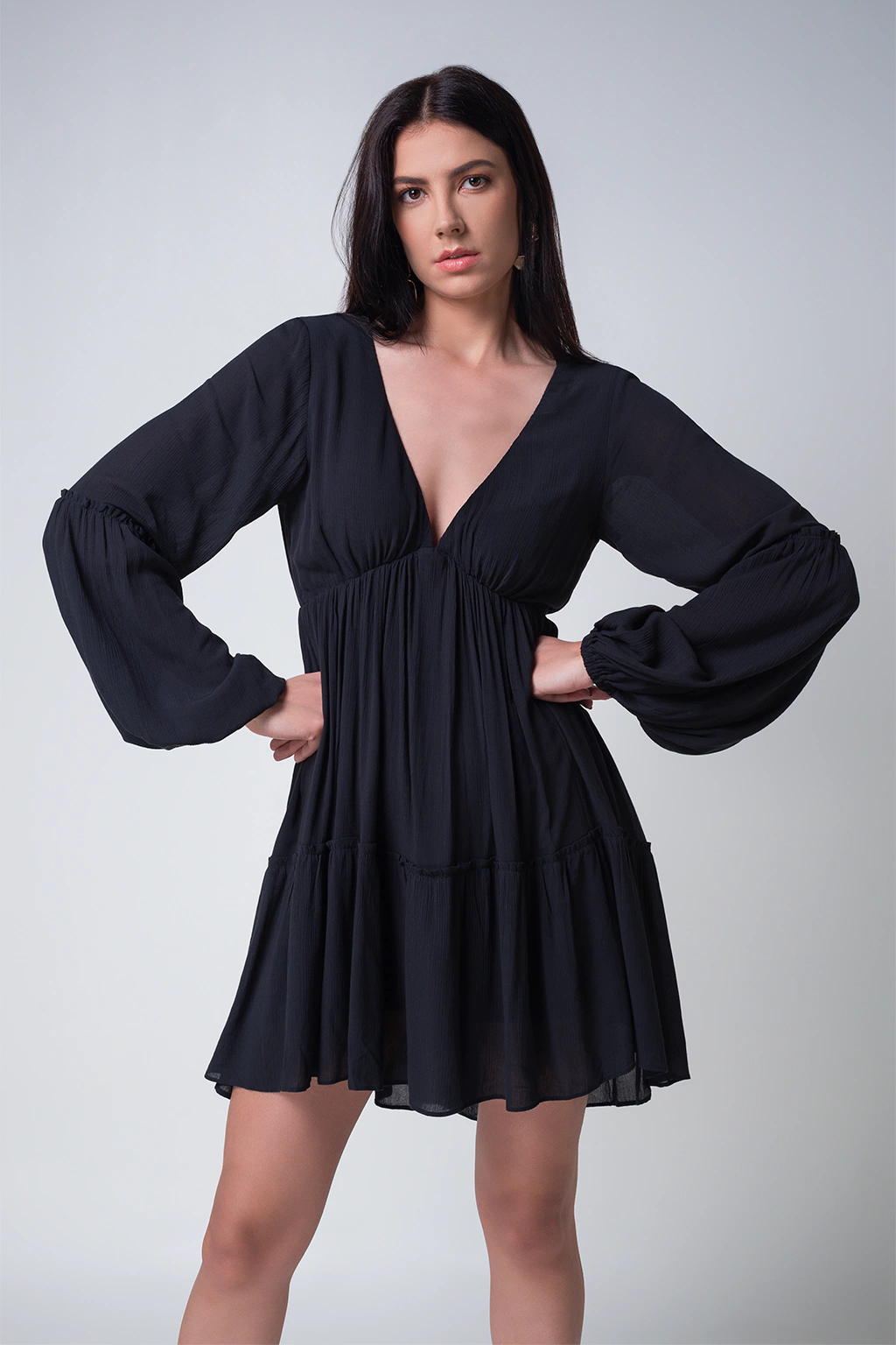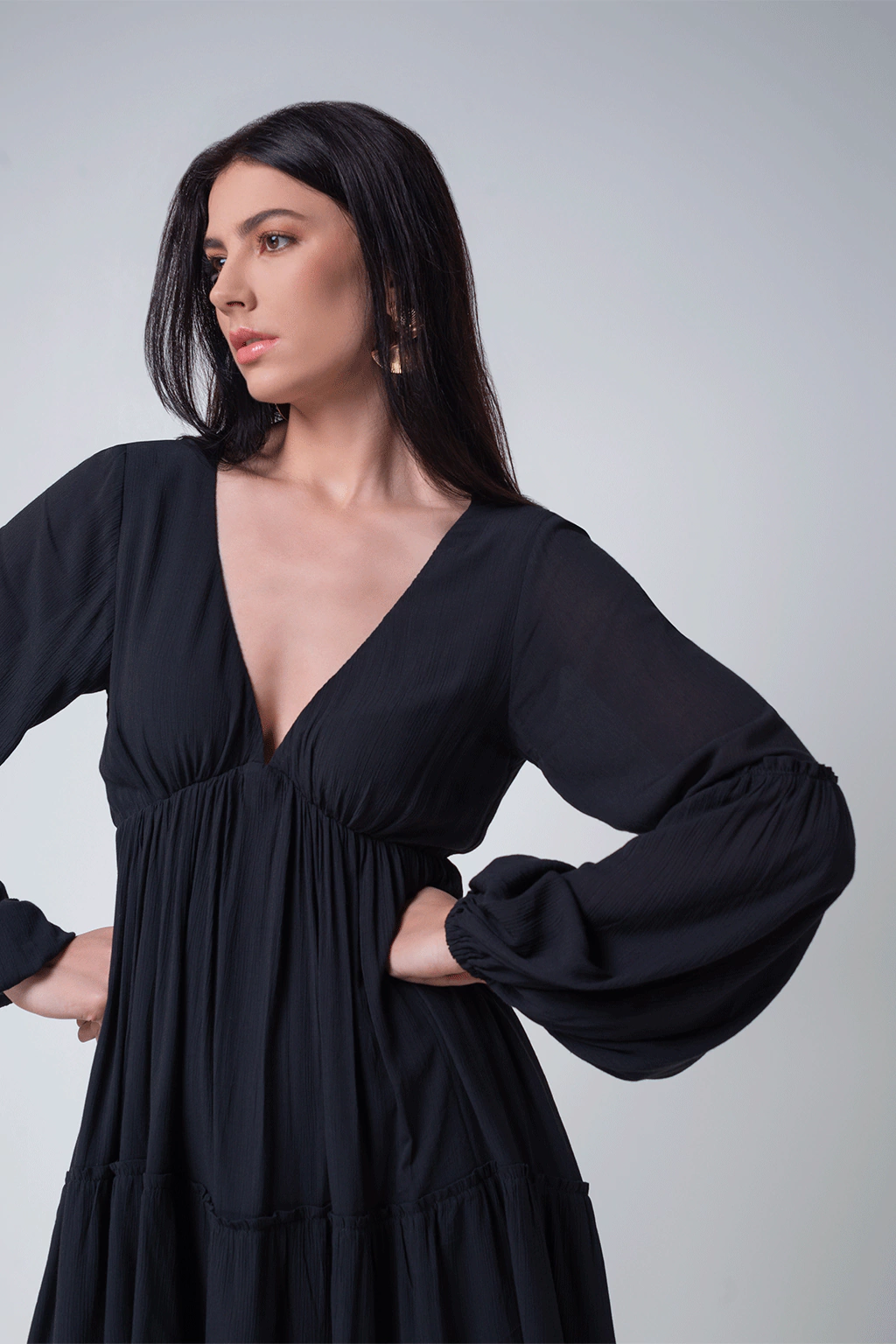 Com tecido leve e caimento fluido esse vestido transita bem em todas estações, com manga longa soltinha e fofa é perfeito para usar a noite com sandália ou uma bota poderosa. Esse vestido preto é aquela peça vestiu e foi, um misto perfeito entre modelagem confortável e visual poderoso que deixa qualquer mulher mais confiante.