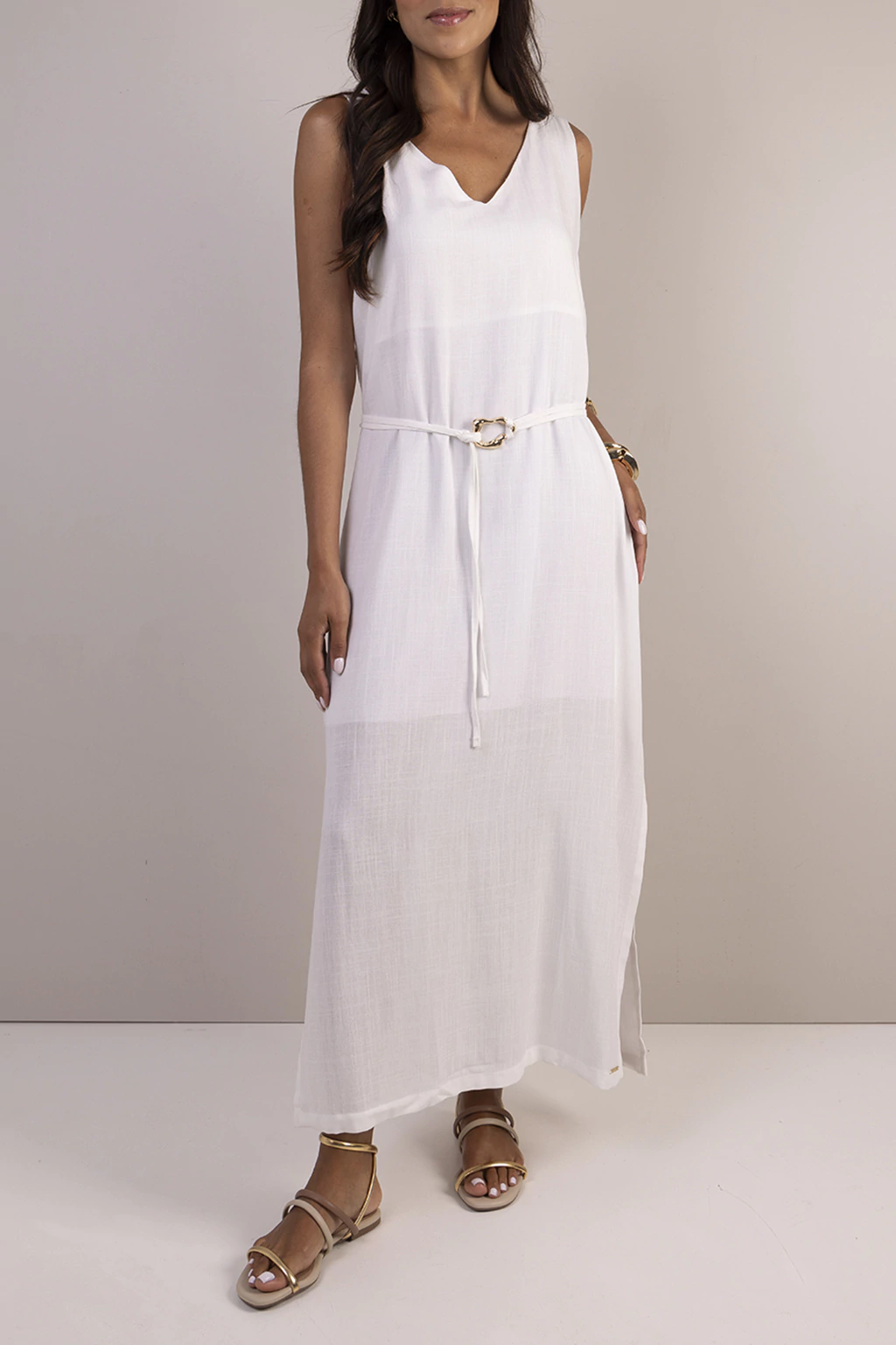 Confeccionado em tecido leve e fresco, na cor Off White, alças largas, decote V, fendas nas laterais, comprimento midi, acompanha cordão com aviamento orgânico dourado para marcar a cintura, possui forro.