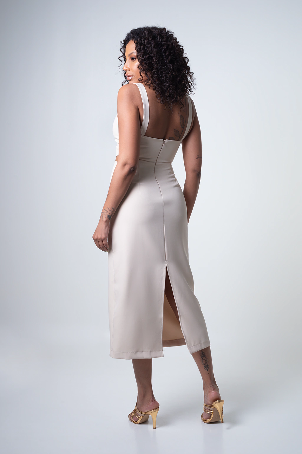 O vestido é confeccionado em tecido estruturado e toque macio, na cor creme, fechamento com zíper invisível, alças médias, recortes assimétricos abaixo do busto com pele a mostra, fenda na parte de trás, comprimento midi, possui forro. Composição do Tecido: 95% poliéster 5% elastano – Forro 100% poliéster