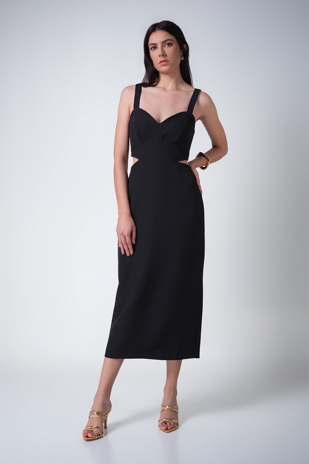 O vestido é uma peça prática, vestiu e saiu. Esse vestido com caimento reto, recortes assimétricos com pele a mostra que valoriza o shape e é perfeito para diversas ocasiões e estações. Para um evento ou jantar use com uma sandália. Já nas estações mais frias você pode usar com bota e casaco.